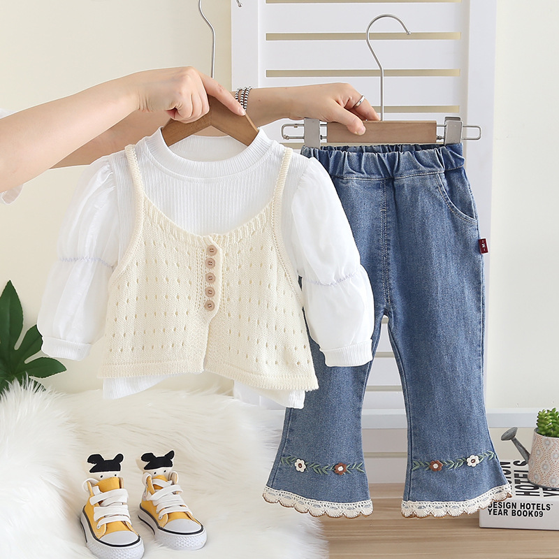Set di tre pezzi con gilet e maglione per bambine 2025, nuovo abbigliamento per bambini alla moda per la primavera e l'autunno.