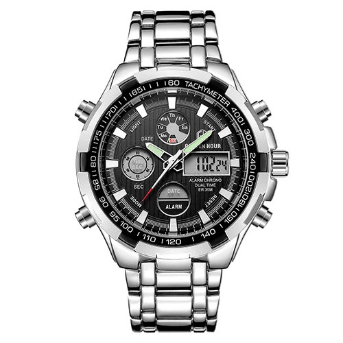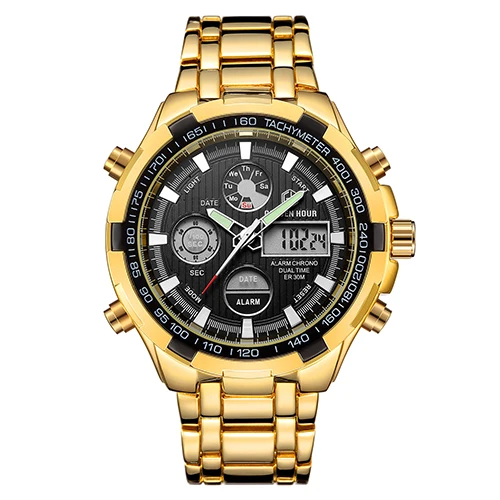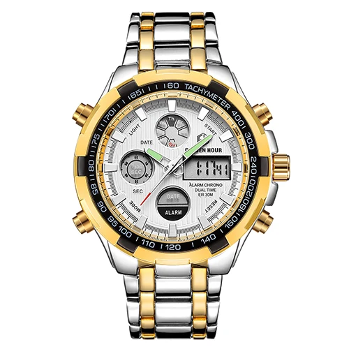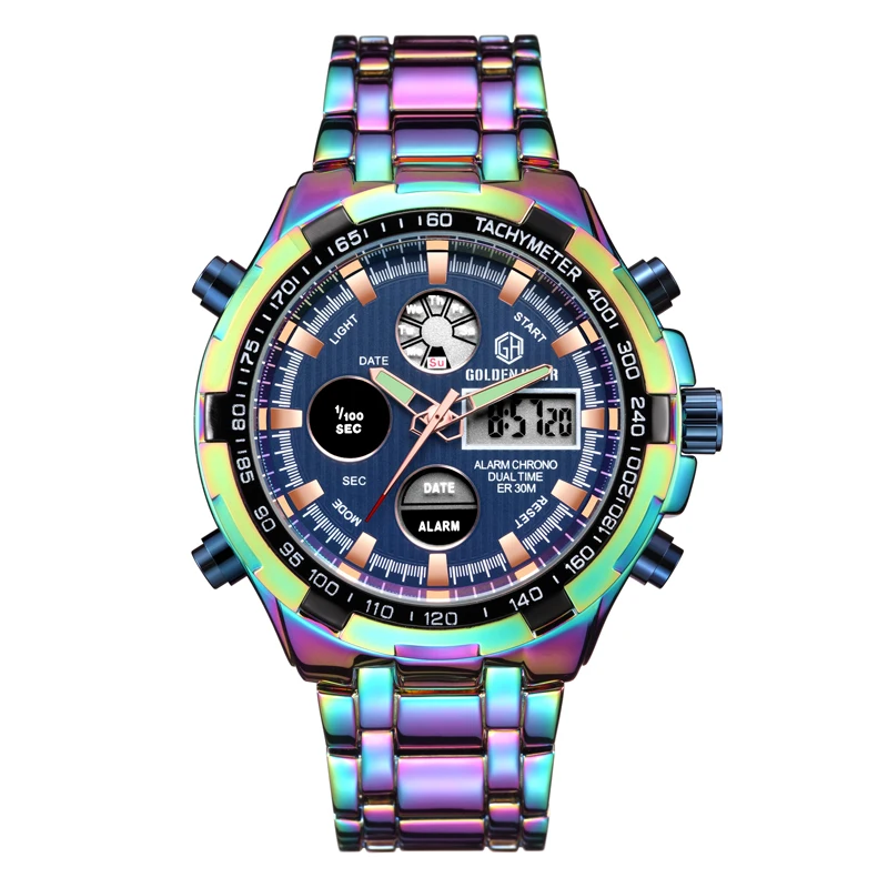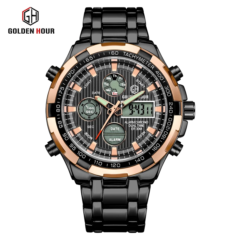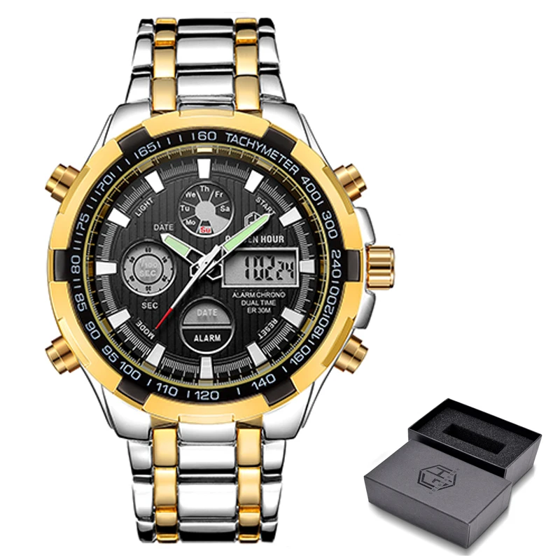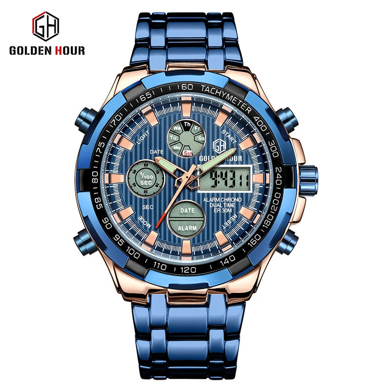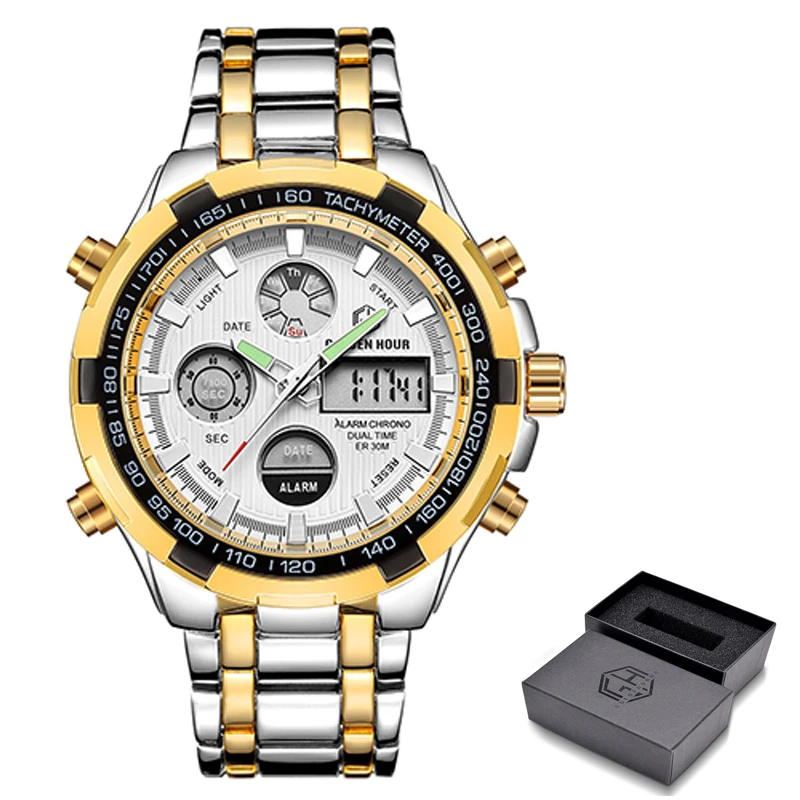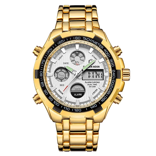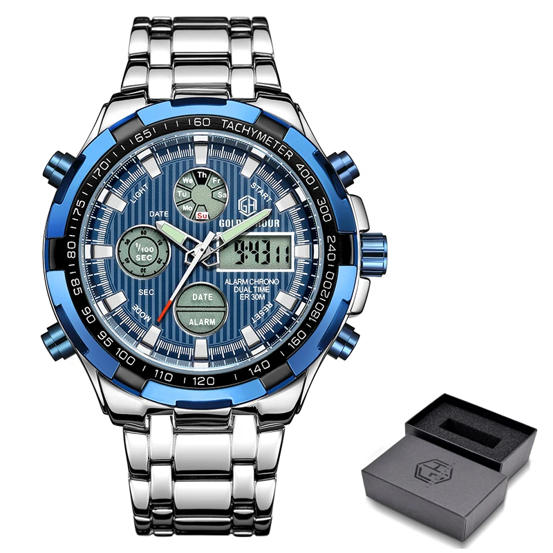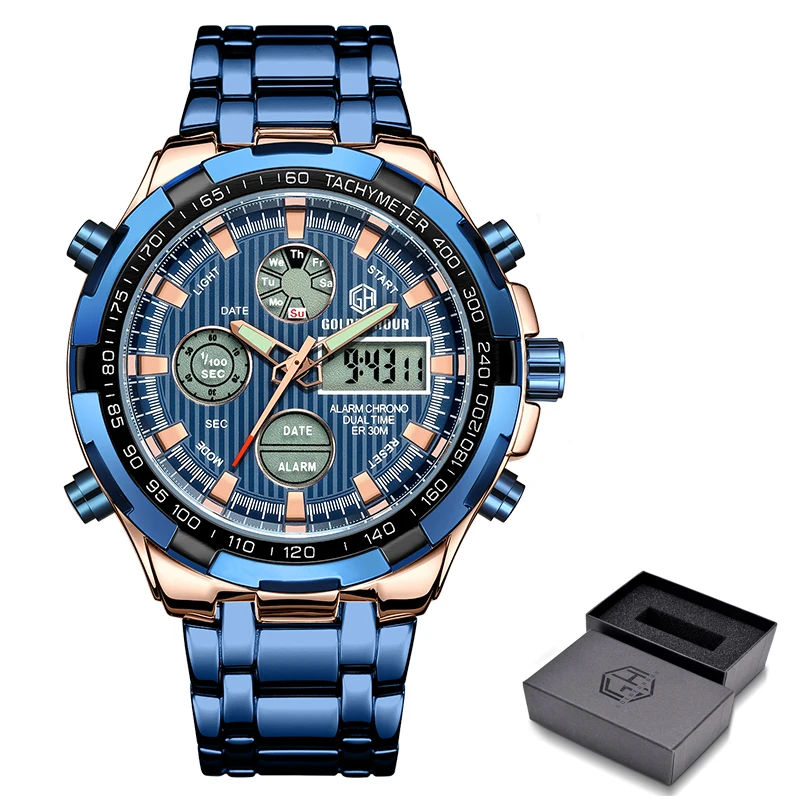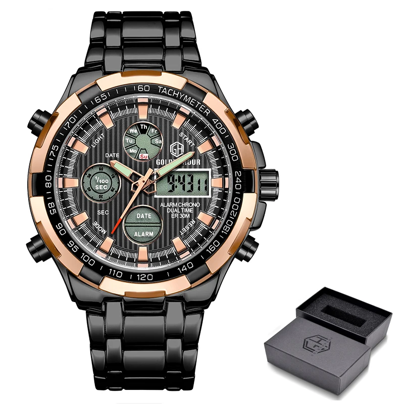Case Thickness:16mmBand Width:20mmBand Material Type:Stainless SteelCase Shape:RoundDial Window Material Type:HardlexBoxes & Cases Material:PaperModel Number:GH-108GBDial Diameter:47mmFeature:Back Light,Alarm,Water Resistant,Week Display,luminous hands,Shock Resistant,STOP WATCH,Auto Date,LED DisplayWater Resistance Depth:3BarClasp Type:Folding Clasp with SafetyBand Length:25cmCase Material:AlloyMovement:QuartzStyle:LuxuryBrand Name:GOLDENHOUROrigin:Mainland ChinaCertification:NONEItem Type:Quartz Wristwatches