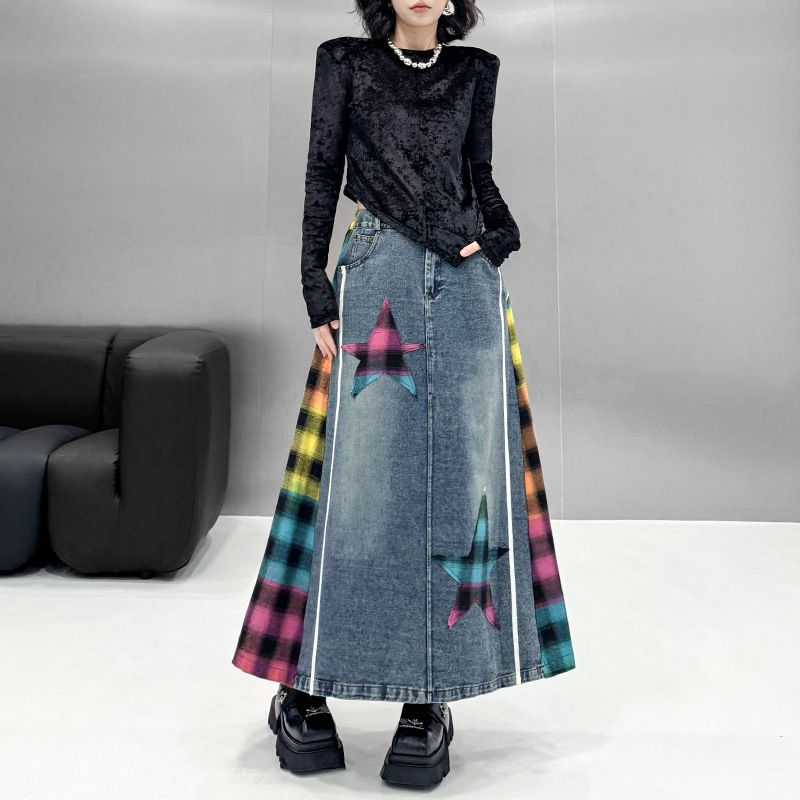 Gonna a trapezio di media lunghezza, in denim patchwork scozzese, firmata Verve, primavera 2025, nuova moda