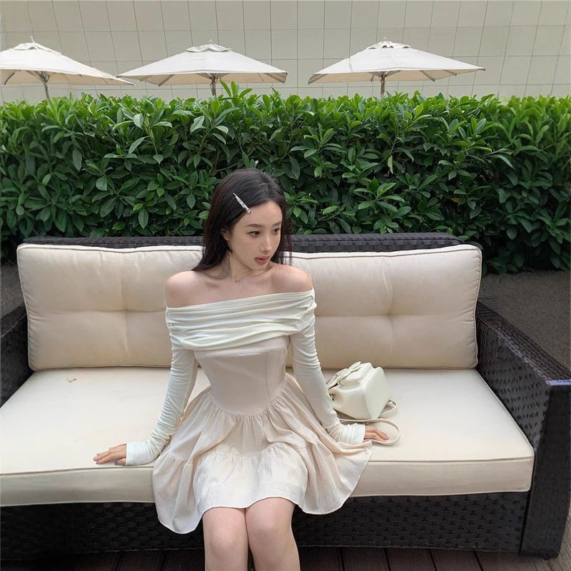 One shoulder niche slimming short skirt temperament black design sense pleated A-line skirt long sleeved dress for spring and autumn women===The actual product has been improved, and the pleated design sense is not as strong. Please be cautious when taking photos if you mind