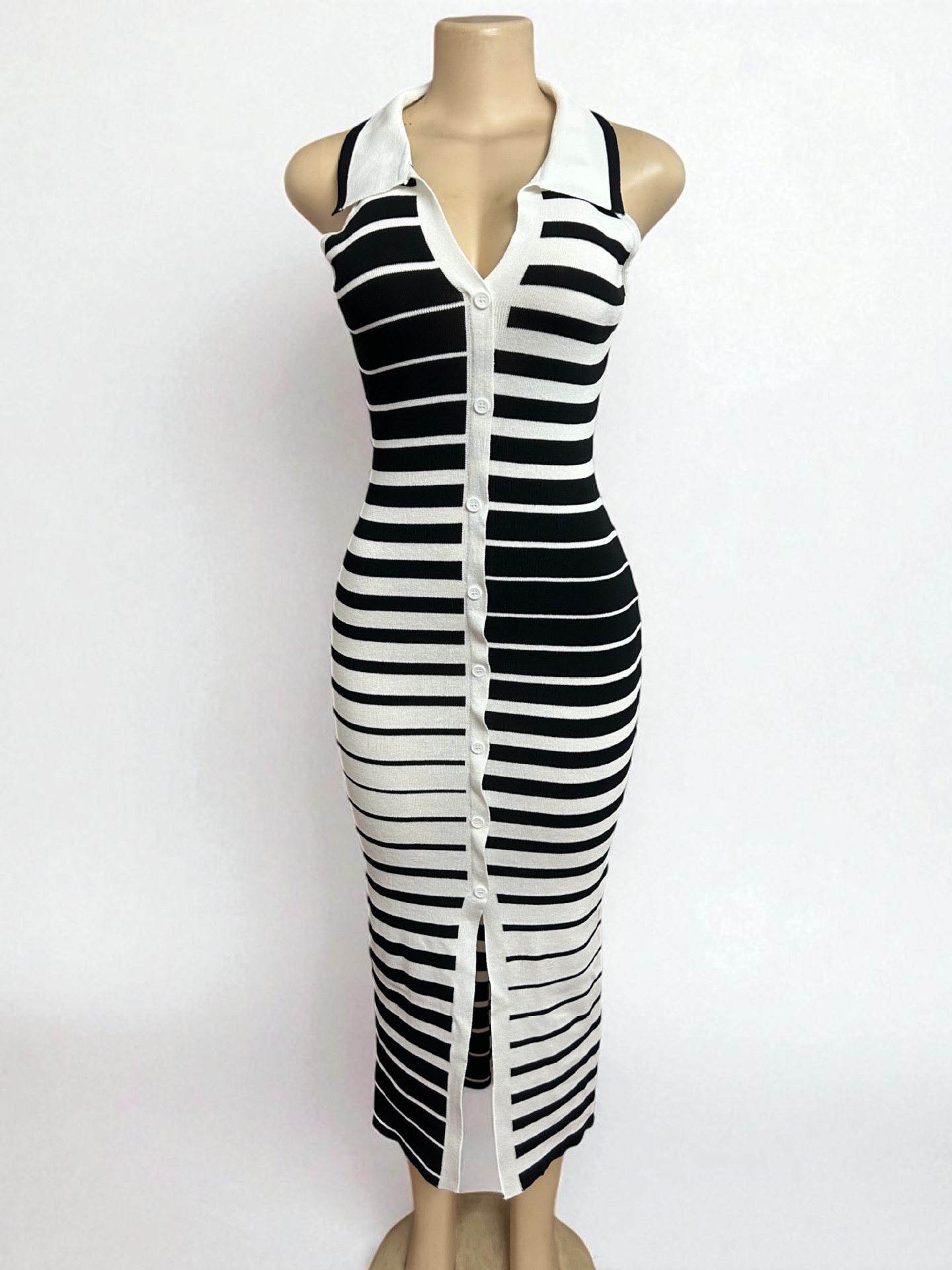 2025 Cross-Border New Dress Plus Size Dress Women Summer Black and White Striped Dress Slit Slim Dress Fashion Turn-Down Collar Knitted Dress Elegant Color-Block Dress African Foreign Trade Women's Clothing Wholesale Independent Station /ONON/JUMIA//SHOPIFY/MERCADO/WALMART Cross-Border Women's Clothing Customization