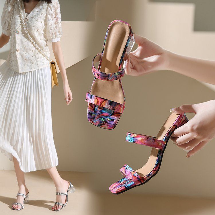 Japanese and Korean graffiti with square toe thick heel slippers, women's crystal high heels fashion sandals, Heel shoes
