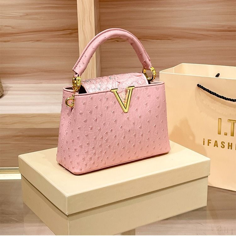 Guangzhou Shiling Bag 2024 New Ostrich Pattern V-shaped Small and Luxury Light Luxury High Sense Handheld Crossbody Bag