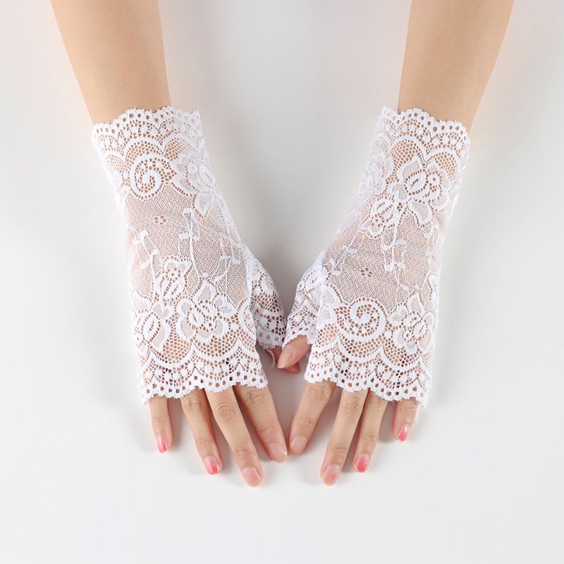Guanti da sposa corti estivi da donna, con protezione solare, senza dita, in pizzo, per decorazioni e galateo