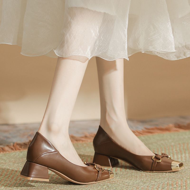H976-10 Scarpe da donna con tacco alto e grosso, punta quadrata, soletta in pelle di pecora, tacco basso, marrone, stile semplice