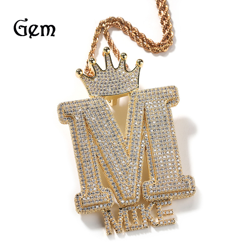 Hip Hop Crown Button Letter Trendy e alla moda in rame con zircone e ciondolo con diamanti pieni
