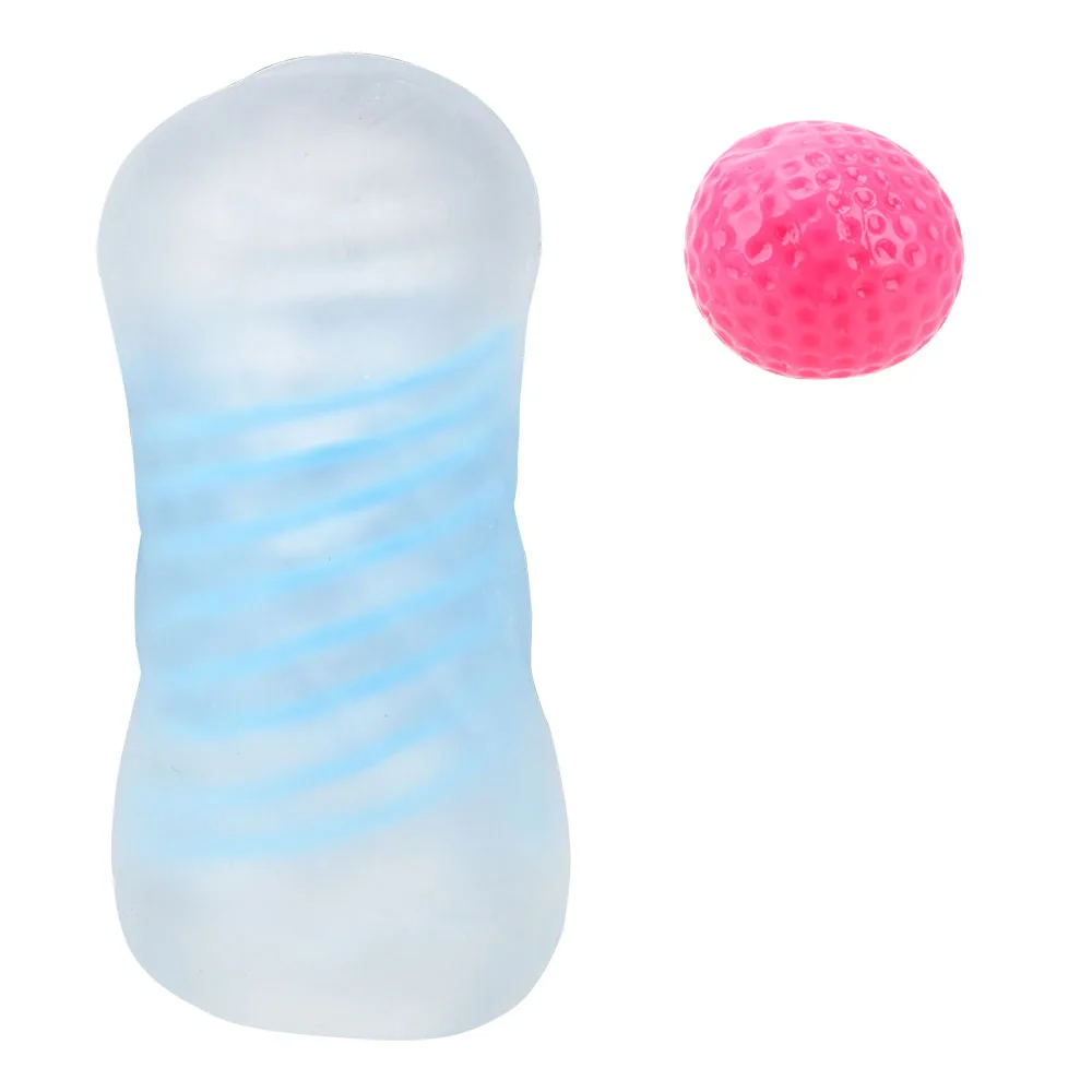 A transparent, flexible cup with an equally soft but not smooth red ball.