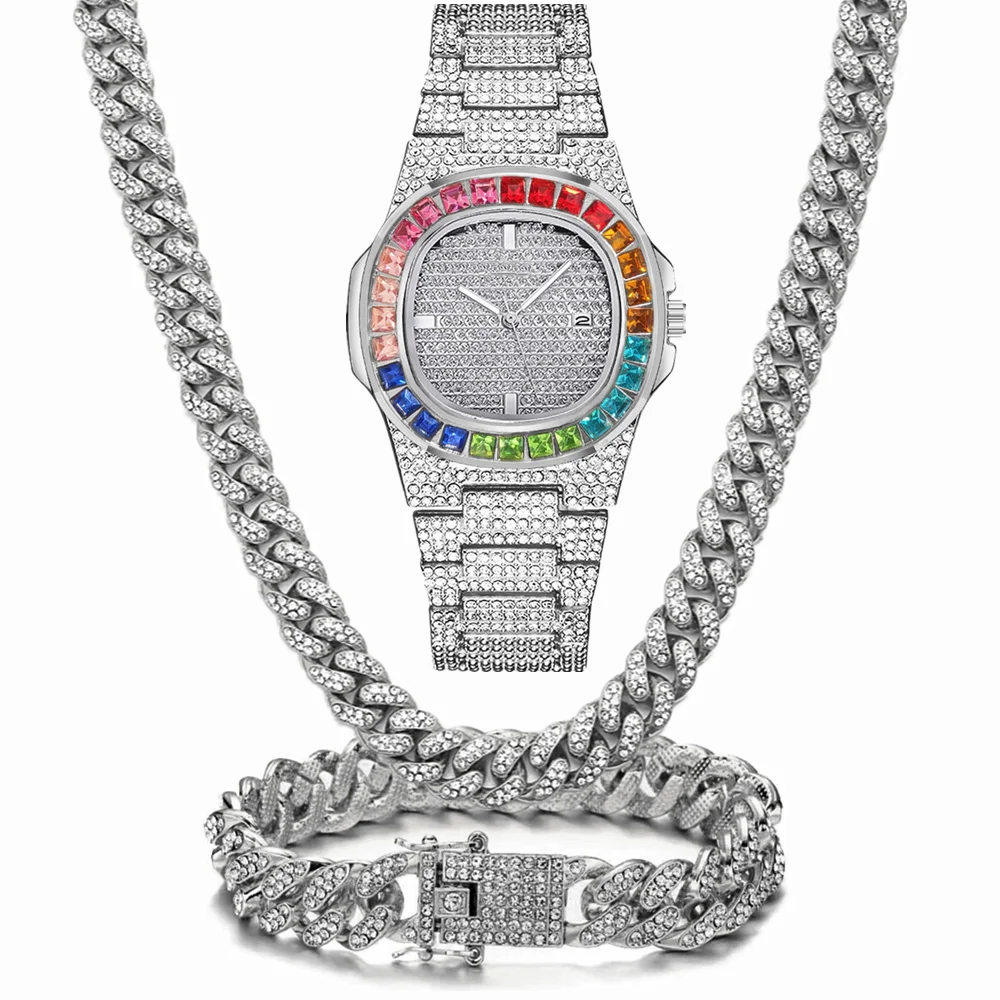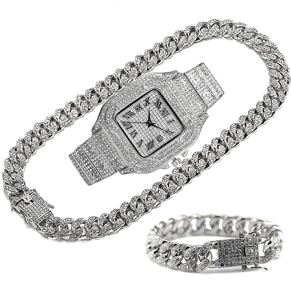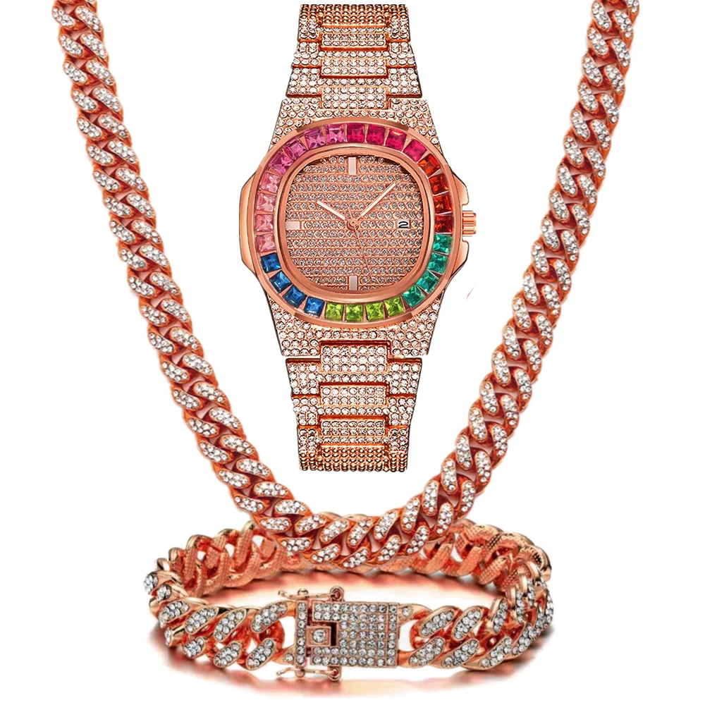 Iced Out per donna Hip Hop Miami Bling CZ cubano grande catena collana pavé strass oro orologio uomo