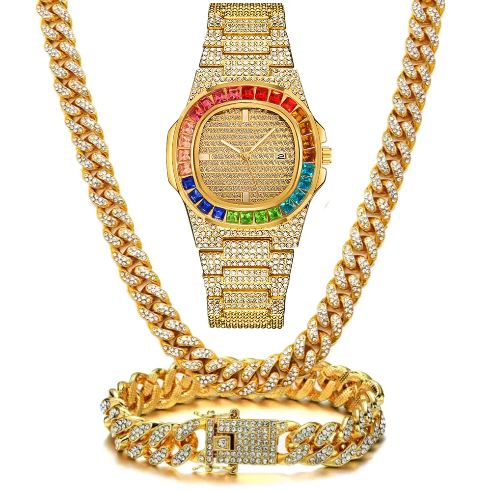 Iced Out Watch for Men Women Hip Hop Miami Bling CZ Cuban Chain Big Gold Chain Necklace Paved Rhinestones Gold Watch Men