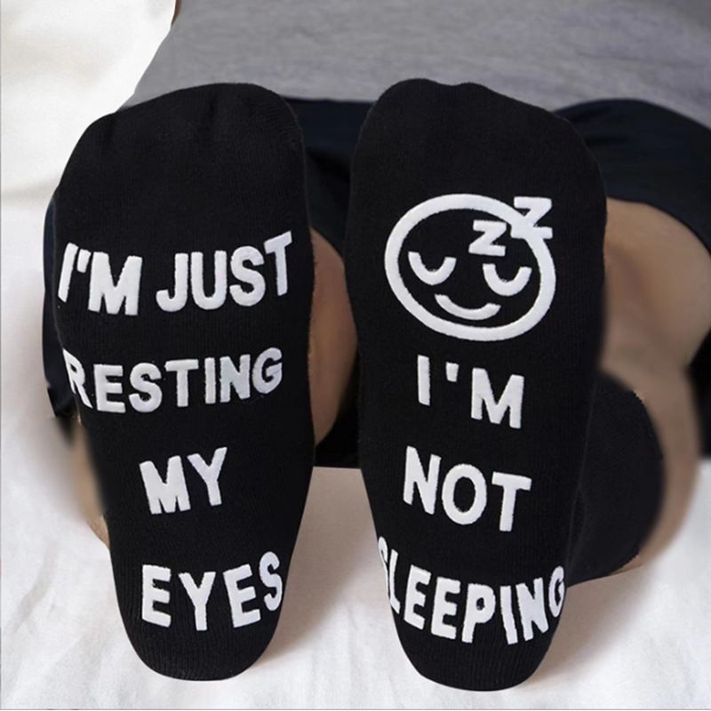 Versatile Design:These socks are designed to be unisex, making them suitable for both men and women. They are perfect for young adults and teenagers. Four-Season Use:These socks are suitable for use in all four seasons, providing comfort and warmth throughout the year. Non-Slip Feature:The non-slip feature of these socks ensures they stay in place all day long, providing optimal comfort and preventing any discomfort or irritation. Durable Material:Made from high-quality material, these socks are durable and long-lasting, ensuring value for your money. Unique Pattern:The unique 'I'M JUST RESTING MY EYES' pattern on these socks makes them stand out, adding a touch of style to your everyday wear. Bulk Availability:These socks are available in bulk, making them an ideal choice for retailers and businesses.
