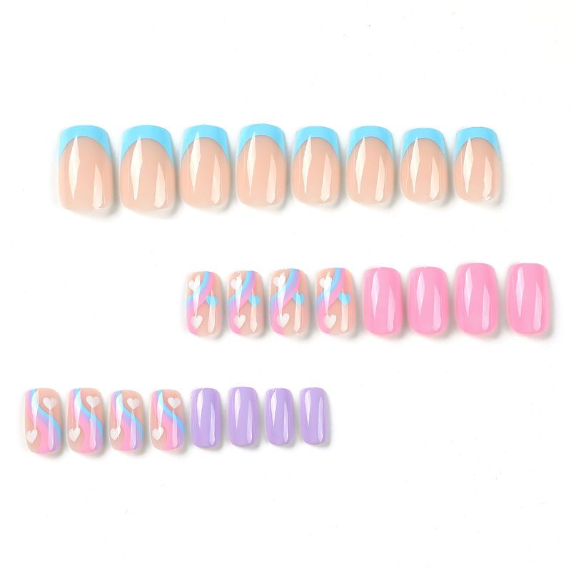 Wearing blue French purple nail plates with multi-color wavy white heart nail plates, finished nail