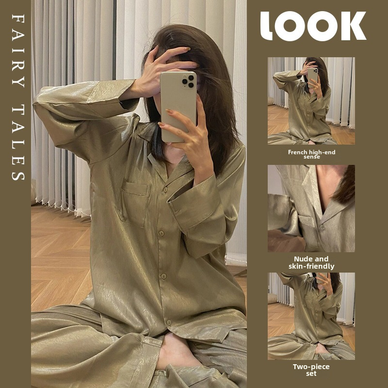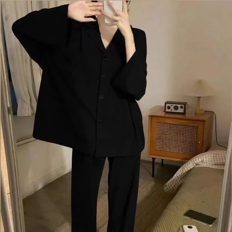 ins Cyber Celebrity Lace Maniche lunghe Semplice Nero Primavera e Autunno Maniche lunghe Pantaloni Cardigan Pigiama Donna Dolce Largo Casa Vestiti
