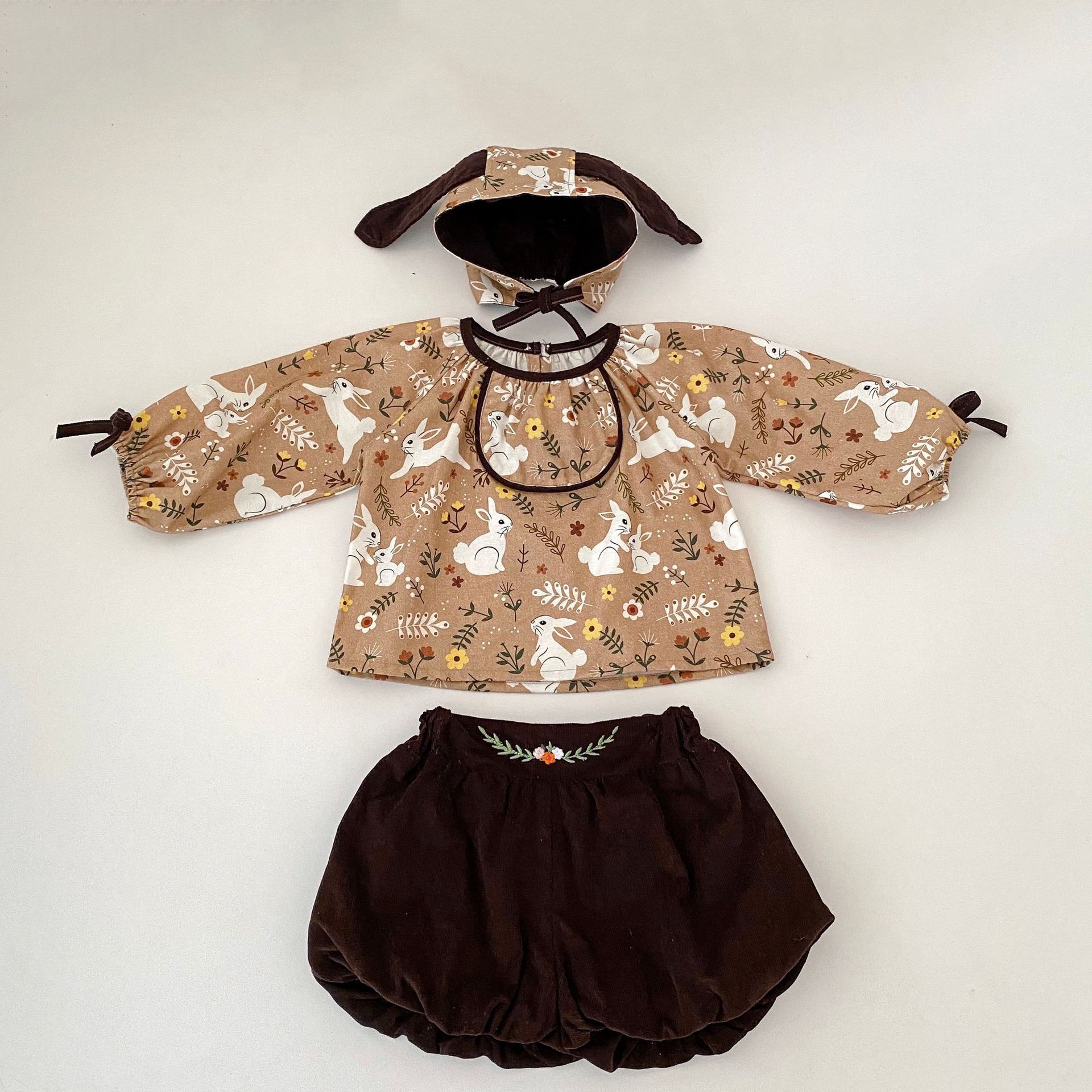 Ins2024 Abbigliamento autunnale per bambina, con stampa a forma di coniglio, top a maniche lunghe + pantaloni tinta unita + cappello, set da 3 pezzi