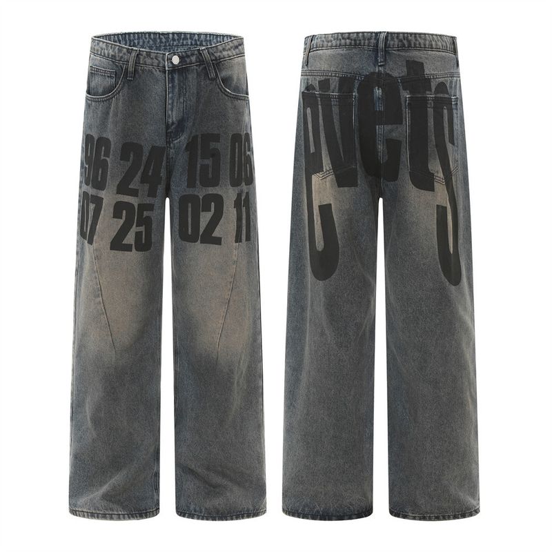 Post-apocalyptic Style English Number Print Cargo Jeans Men's Hip-hop Trend Niche Loose Wide-leg Straight Long Pants