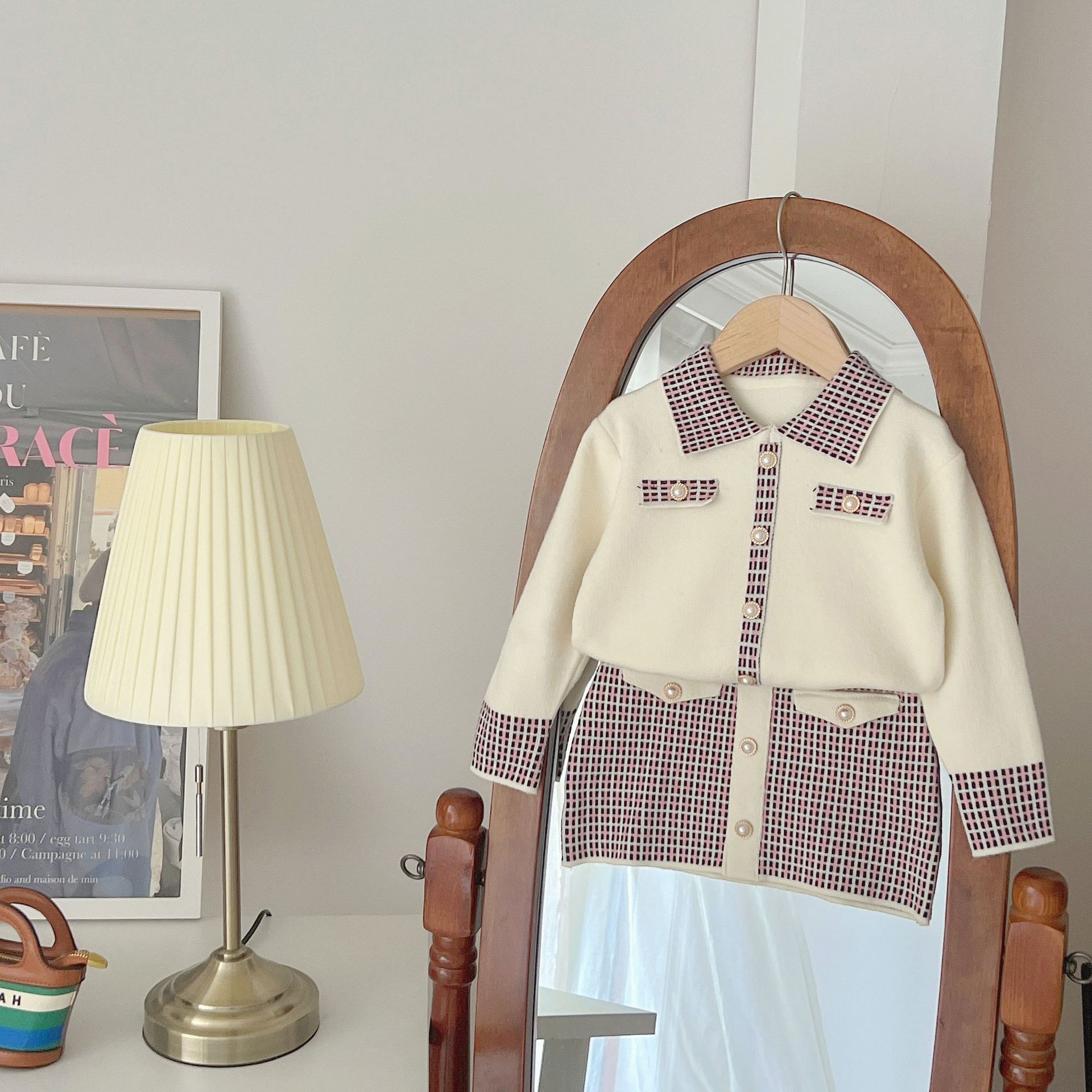 JINYONG Girls' Knitted Fragrant Polo Neck Sweater Wrap Skirt Set with Children's Sweater Checkered Cardigan Short Skirt Two Piece Set