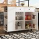 Produktabmessungen: Die Kücheninsel ist 120 cm lang, 42 cm breit und 91,5 cm hoch, und dieser Küchenwagen hat klappbare Seiten, die ausgeklappt werden können, um als Esstisch zu dienen, die Gesamtlänge der eingeklappten Seiten im ausgeklappten Zustand beträgt 76 cm.Die Tischplatte besteht aus hochwertiger, dichter Platte mit Holzmaserung. Das Material ist robust und langlebig und hält verschiedenen Belastungen im täglichen Gebrauch stand. Sie eignet sich als Küchenarbeitsplatte und ist praktisch zum Gemüseschneiden, Zubereiten von Mahlzeiten und für andere Aktivitäten. Die Schublade ist mit einem eleganten Griff aus Zinklegierung ausgestattet, der ergonomisch gestaltet ist, um das Öffnen der Schranktür zu erleichtern.Das schöne Türdesign harmoniert mit dem Gesamtstil des Speisewagens, wodurch die Schönheit des Erscheinungsbilds des Speisewagens verstärkt wird und er sich besser in verschiedene Wohnumgebungen integrieren lässt.Er ist ausgestattet mit einem Weinglasregal zum Aufhängen von Weingläsern, einem Snackregal an der Schranktür zum praktischen Aufbewahren von Snacks, das Seitenregal kann zum Aufbewahren von Gegenständen verwendet werden und die innere Unterteilung lässt sich in drei Ebenen verstellen, sodass die Raumaufteilung flexibel an die Größe der Gegenstände angepasst werden kann.Es verfügt über einen multifunktionalen und geräumigen Lagerbereich, in dem eine große Menge an Küchenutensilien untergebracht werden kann. Ob Töpfe und Schüsseln, Zutaten und Gewürze oder verschiedene Snacks – sie alle können problemlos verstaut werden, wodurch die Küche ordentlicher und aufgeräumter wirkt, das unordentliche Stapeln von Gegenständen vermieden wird und die Gesamtauslastung der Küche verbessert wird.Die um 360 Grad drehbaren Räder ermöglichen es dem Imbisswagen, sich frei in alle Richtungen zu drehen. Ob in einem engen Raum oder einem offenen Bereich, die Fahrtrichtung kann problemlos geändert werden, sodass der Imbisswagen bequem an den gewünschten Ort bewegt werden kann, beispielsweise in verschiedene Ecken des Restaurants, verschiedene Betriebsbereiche der Küche usw.