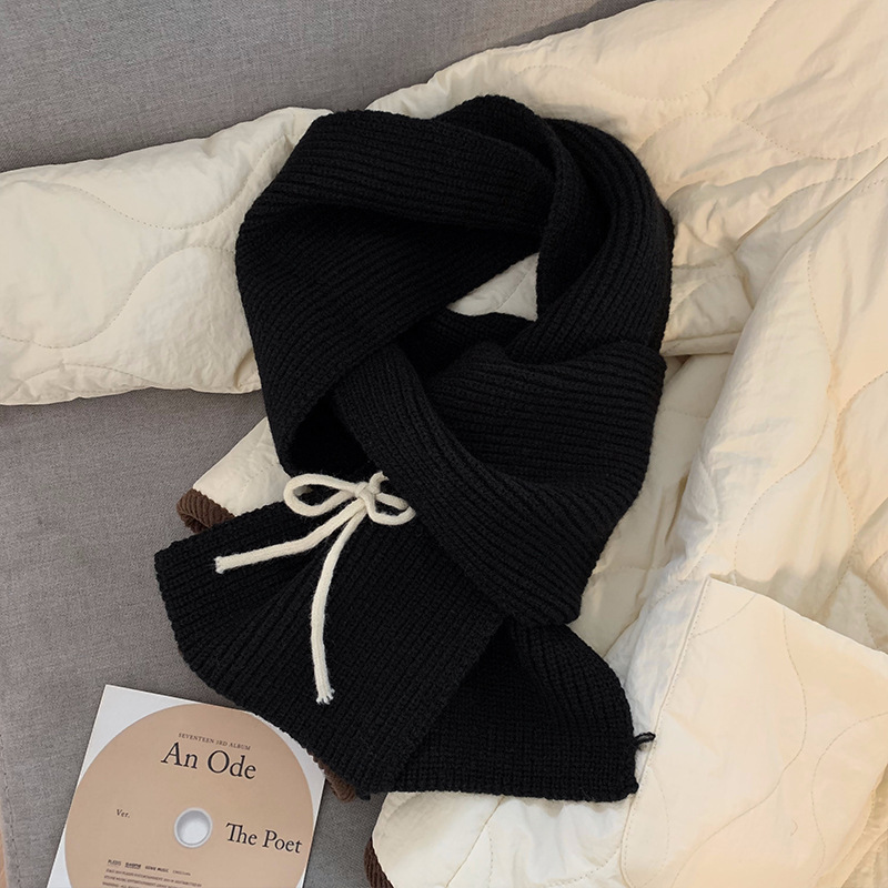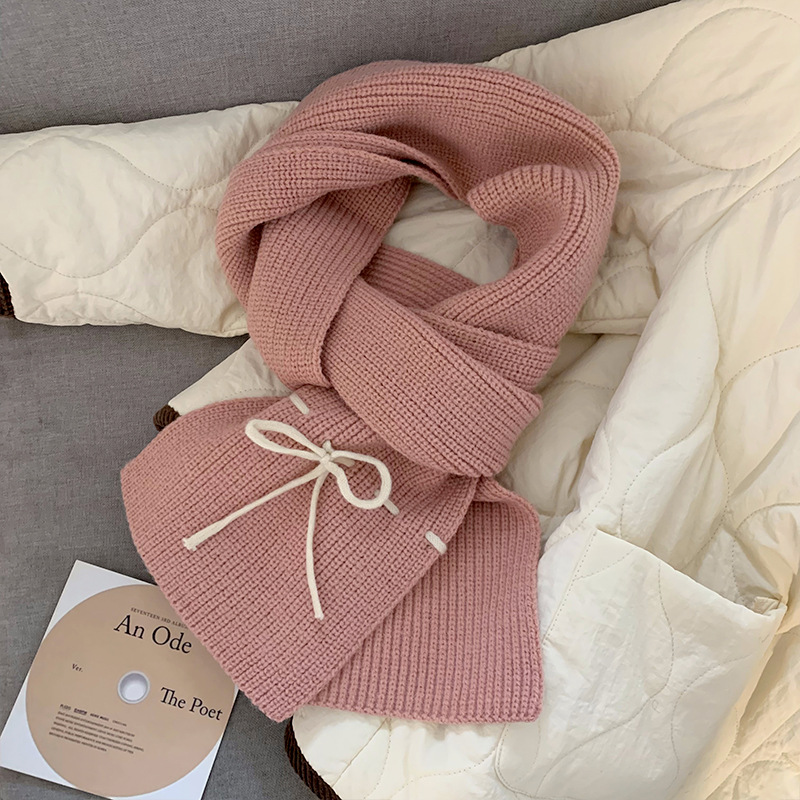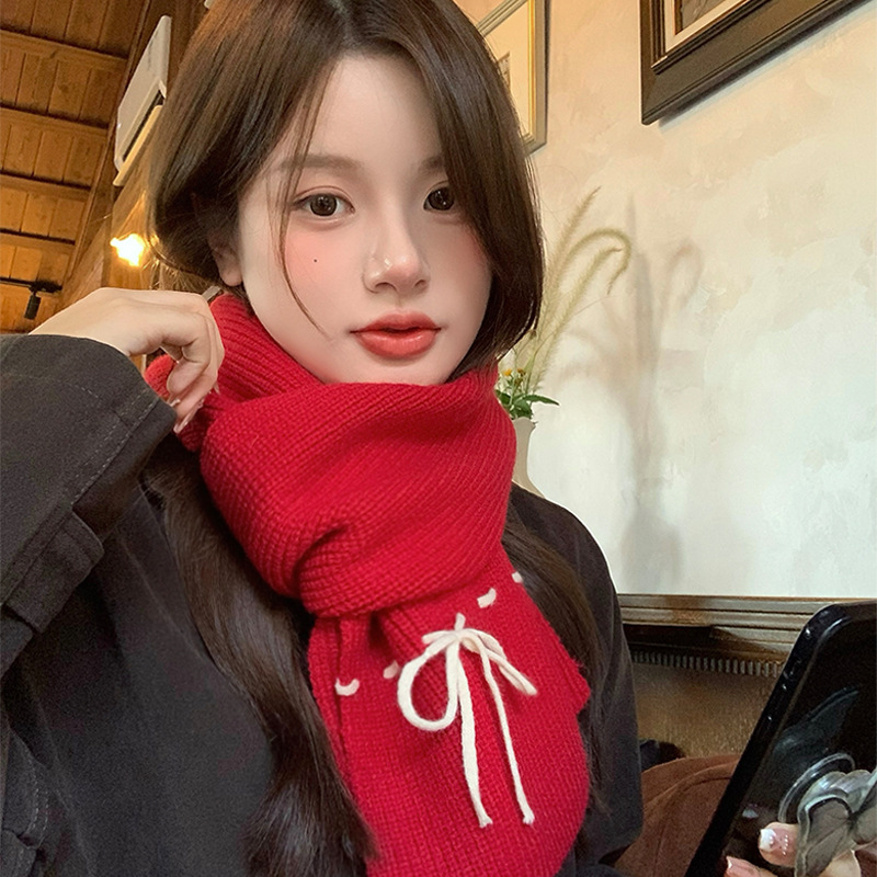 Korean Red Bow Knitted Scarf for Women's Autumn and Winter Atmosphere, Thickened Warmth, Neck Protection, Knitted Shawl, Winter Scarf