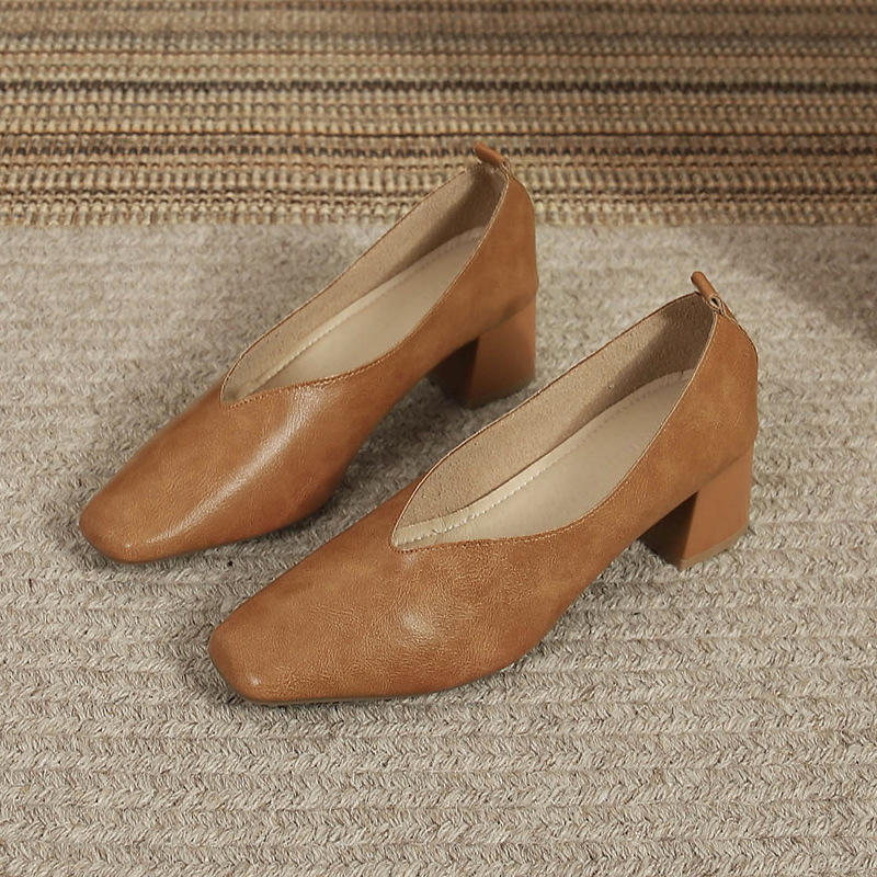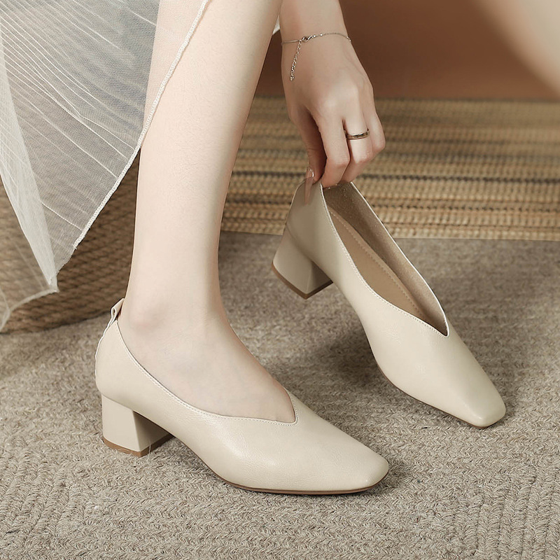 Two layer cowhide medium heeled high heeled women's shoes 2023 square toe grandmother shoes thick heeled shallow cut single shoe casual versatile