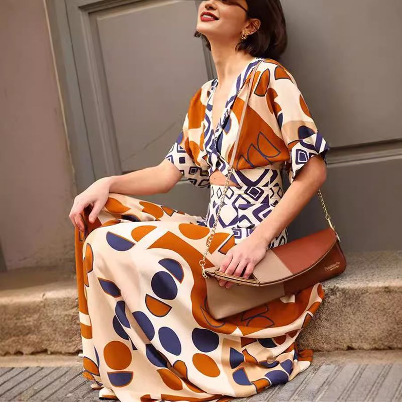 Women's V-neck waist cinched printed dress with fake two-piece splicing fashion 8067