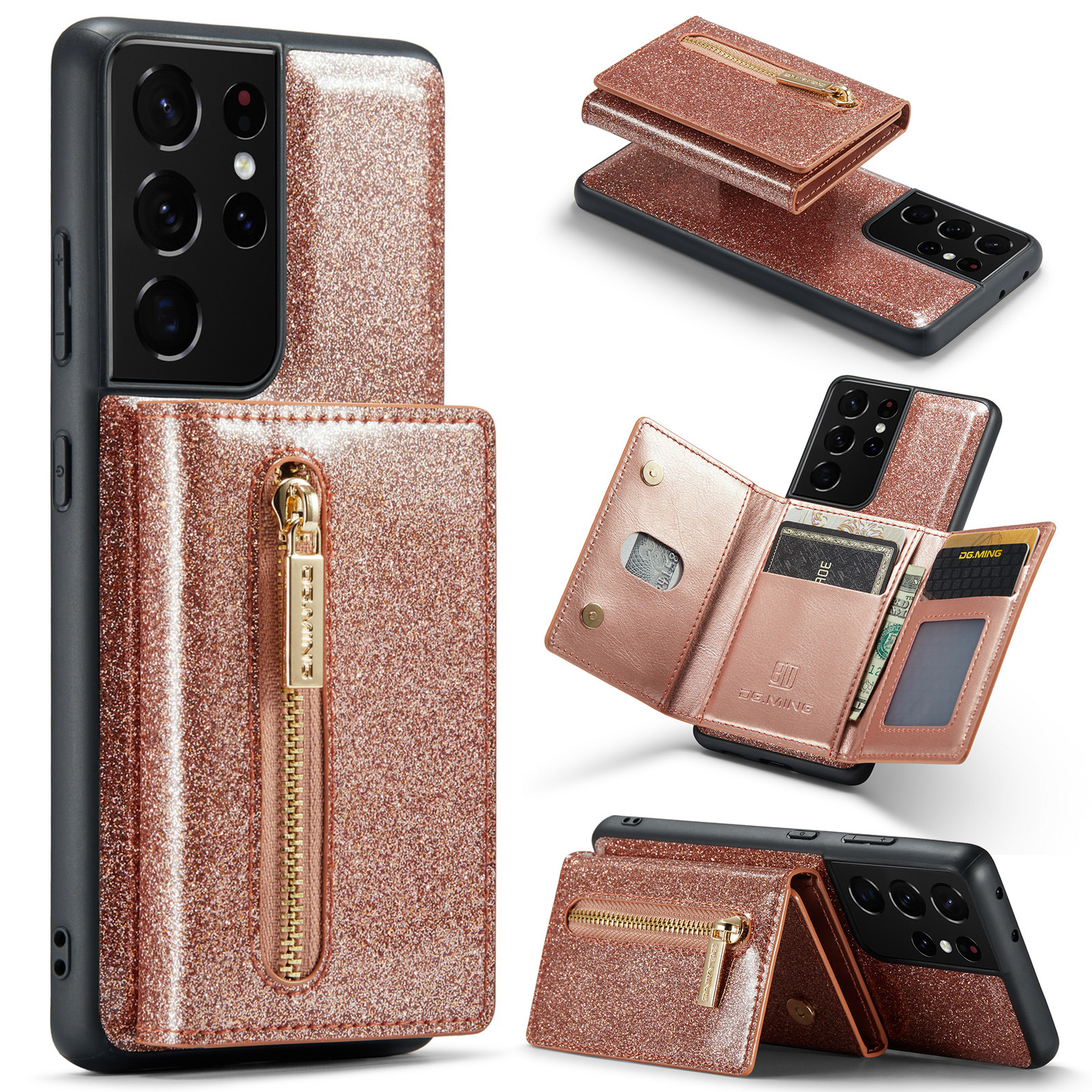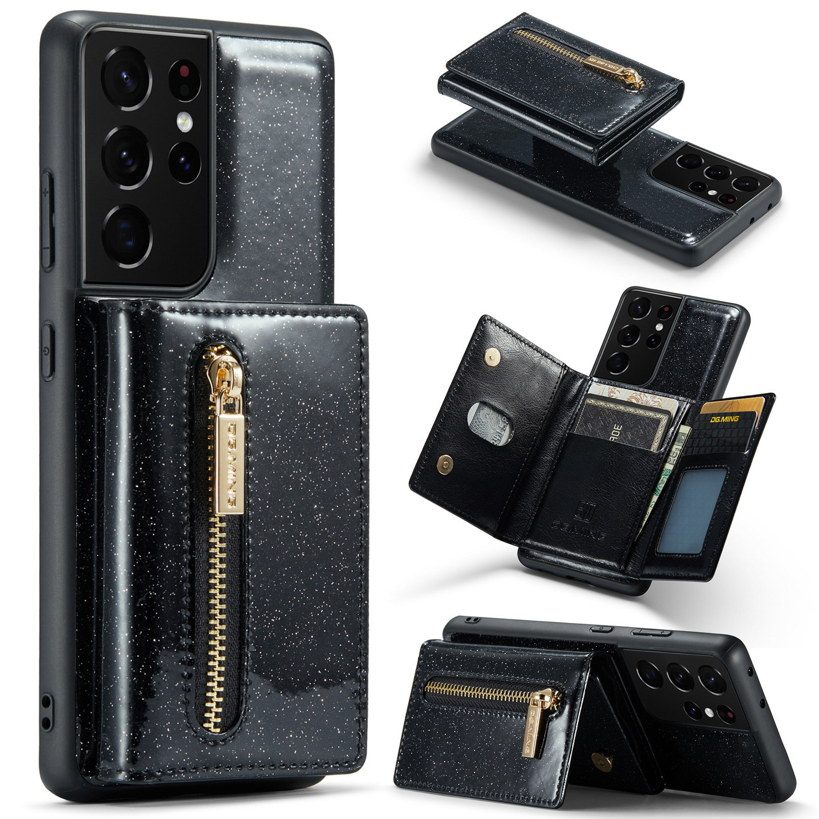 Independent brand Patented product DG.MING-M3 series Glitter magnetic card holder protective case Trifold glitter zipper wallet + glitter leather bottom shell + strong magnetic separation design