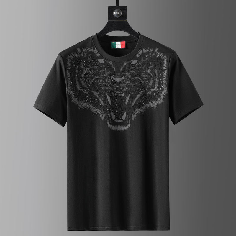 Maglietta a maniche corte da uomo, estiva, casual, con scollo rotondo, a mezza manica, in cotone, con stampa a rombi caldi e testa di tigre, di marca alla moda