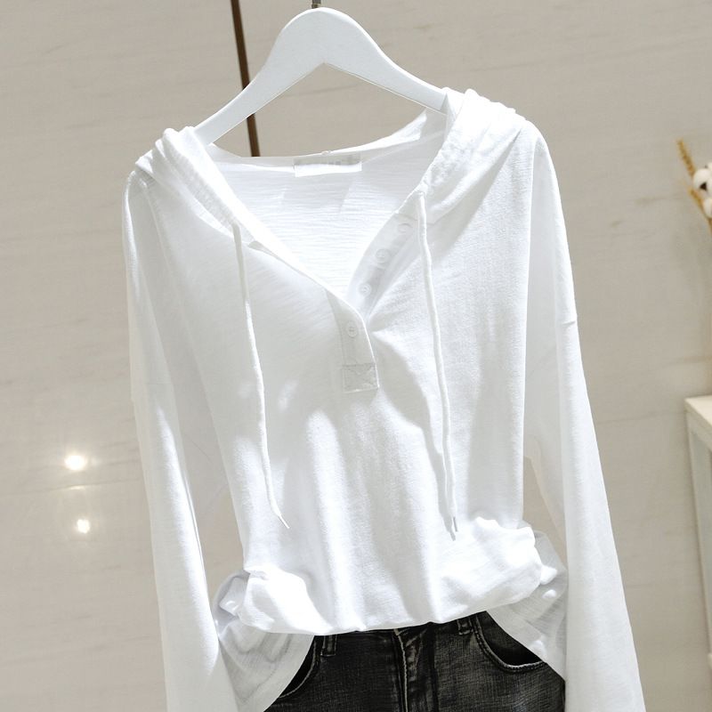 Korean Style White Hooded Long Sleeve T-Shirt for Women 2025 Spring and Autumn New Loose Slimming Inner Layer Base Shirt Top Trendy