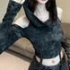 Maglietta a maniche lunghe con cappuccio e spalle scoperte, indossata a mano, in stile terreno abbandonato, per donna, estate 2024, sottile e a vita alta,