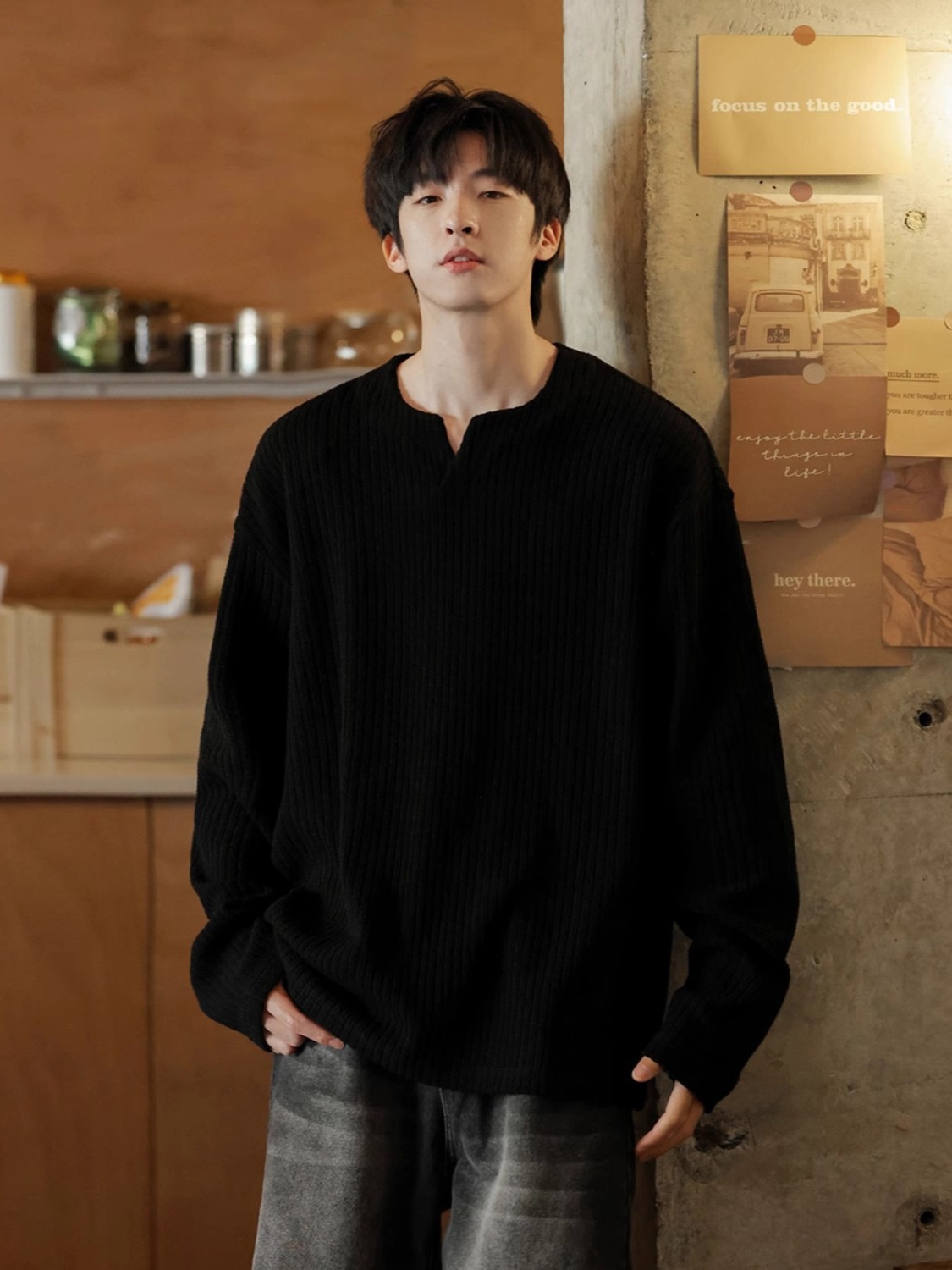 Maglietta a maniche lunghe con scollo a V e trama piccola per uomo, 2025, nuova base interna in stile coreano, stile allentato e pigro, primavera e autunno