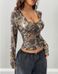 Maglietta aderente con scollo a U e ombelico, modello retrò mimetico, da donna, modello hot girl