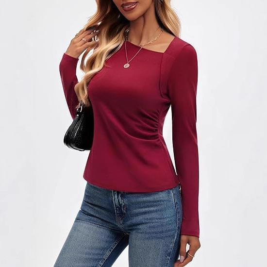 2025 Women's Fashion Long Sleeve Asymmetric Neckline Side Pleat Slim Fit Top Solid Color T-Shirt