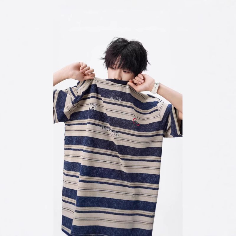 American Style Striped Color-Block Short Sleeve T-Shirt for Men and Women Summer Trendy Brand Loose Fit Versatile Half Sleeve Top