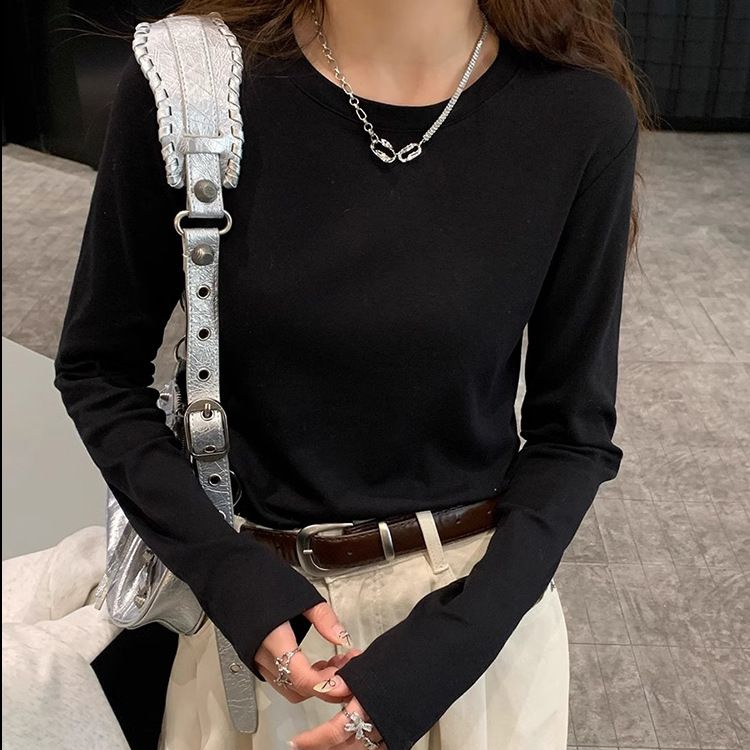 300g Round Neck White Inner Long Sleeve Base Shirt T-Shirt for Women Spring and Autumn Loose Fit Pure Cotton Versatile Tee Top