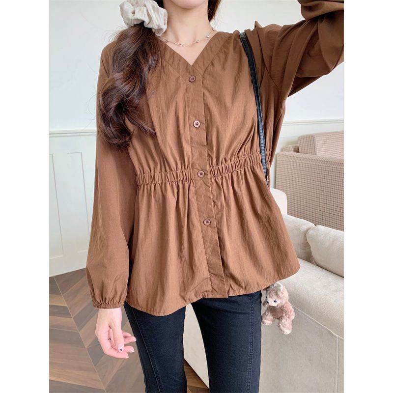 Maglietta da donna alla moda in stile coreano con scollo a V, maniche lunghe, taglie forti, con vita stretta e copertura della pancia, riduzione dell'età