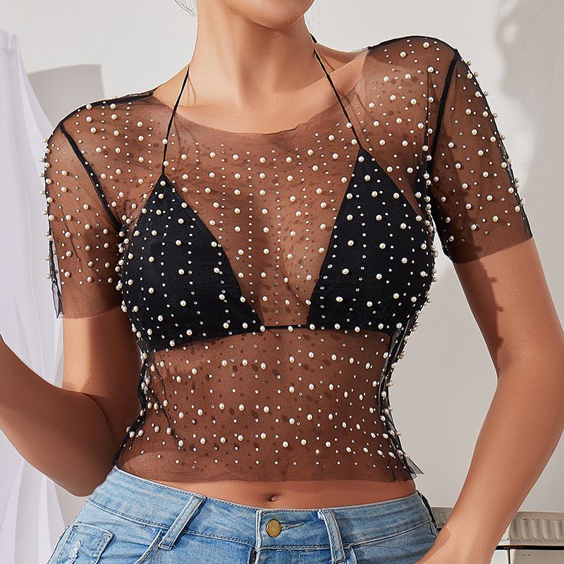 Women's Sexy Sheer Lace Shiny Rhinestone Beaded Short T-Shirt Pearl Mesh Slim Fit Short Sleeve Top