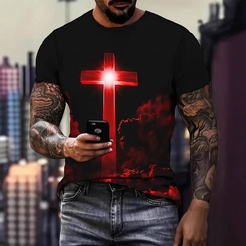 2024 Easter Cross 3D Print Men's High Street Fashion Loose Short Sleeve Crew Neck T-Shirt