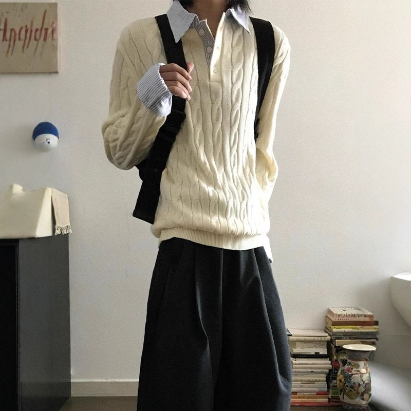 Cable Knit Fake Two-Piece Patchwork Striped Henley Collar Sweater Men's Autumn Lazy High-End Cleanfit Knitwear