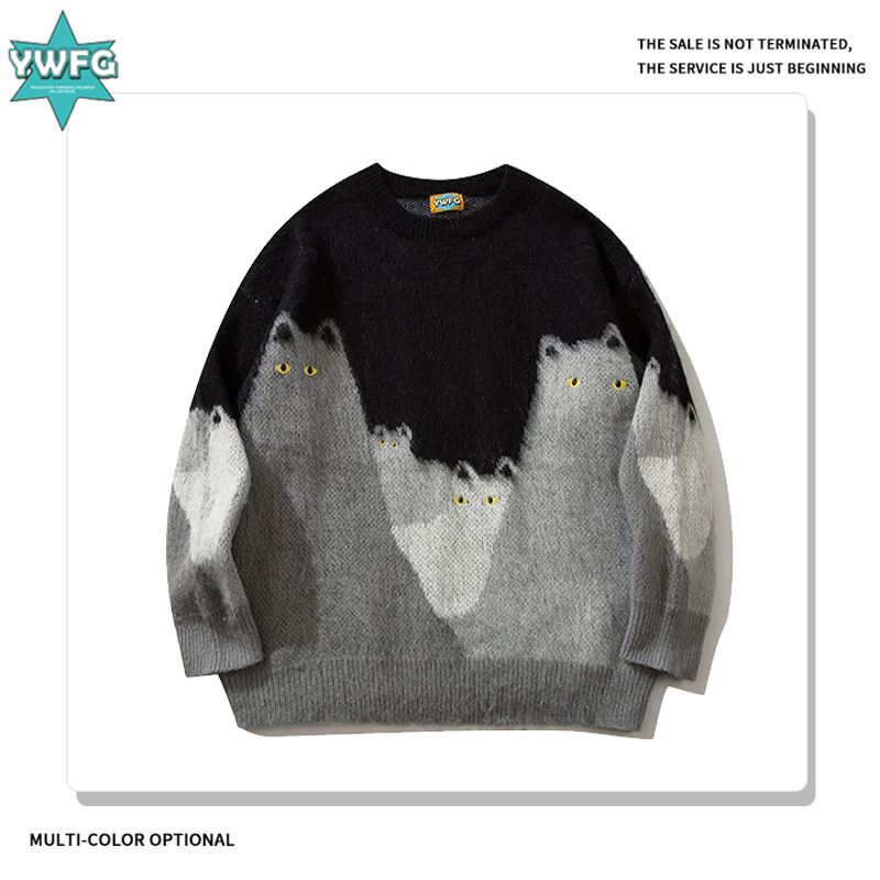 YWFG Cartoon Cat Jacquard Sweater for Men and Women, New Autumn and Winter Lazy Style Casual Crew Neck Pullover Knitwear