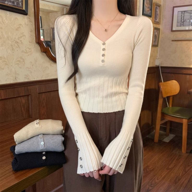 Maglione lavorato a maglia a maniche lunghe con scollo a V, elegante, stile coreano, per donna, versatile e alla moda, corto