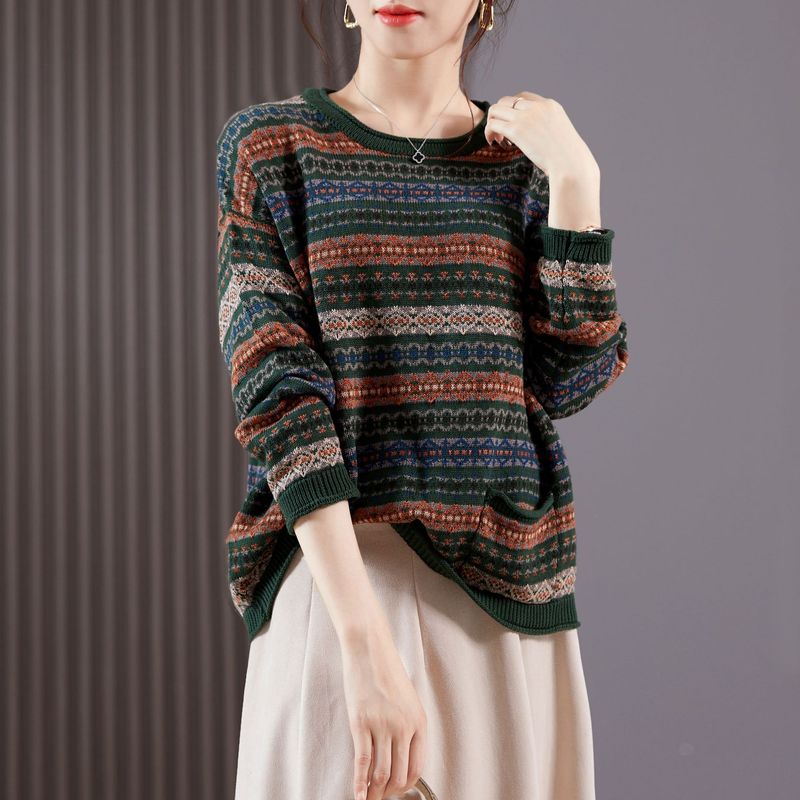 2024 Autumn Women's V-Neck Mixed Color Pullover Loose Casual Style Striped Long Sleeve Knitted Top