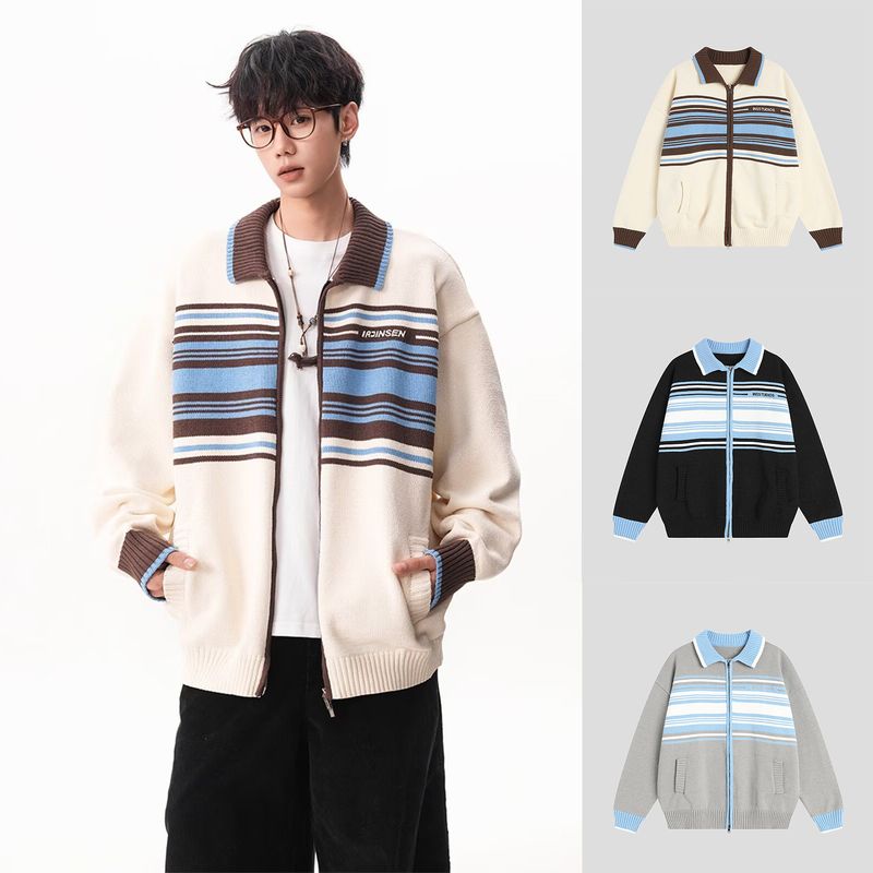 Color Block Striped Lapel Zipper Knit Sweater Men Loose Casual Autumn Winter Cardigan Jacket