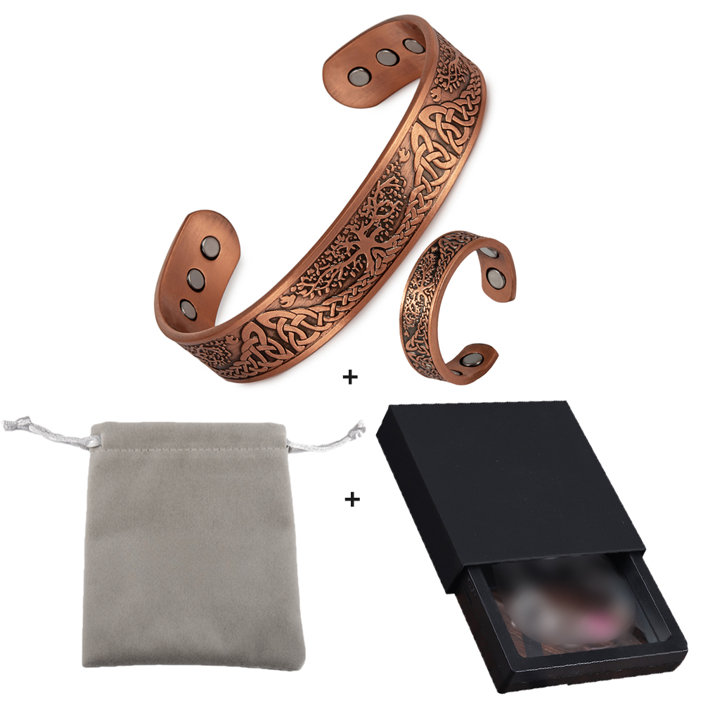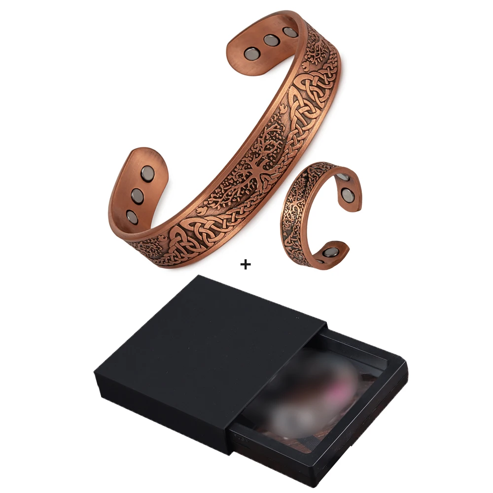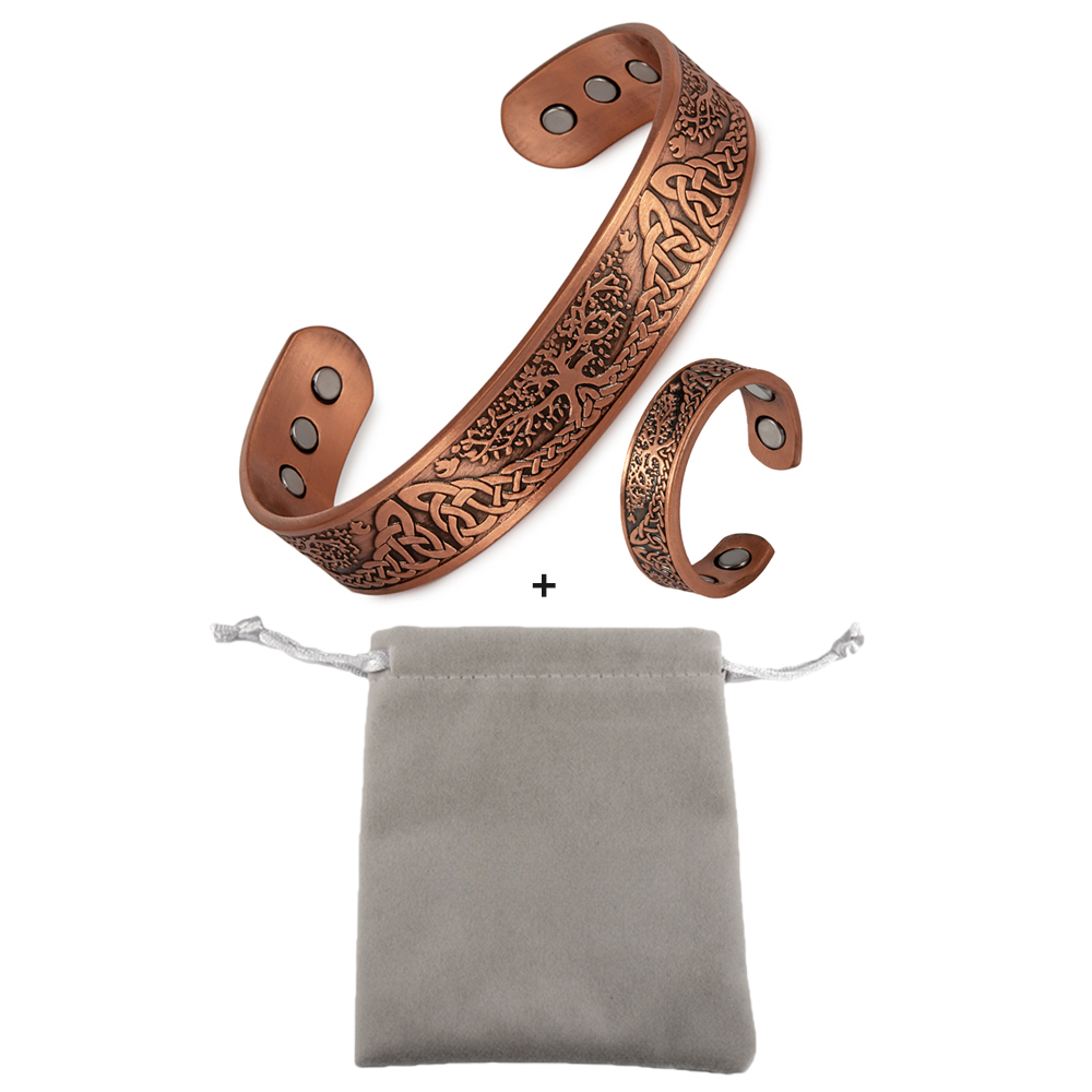 Meathly Set di gioielli in rame puro magnetico Yggdrasil Bracciale vintage regolabile Anello Set di gioielli vichinghi per la salute ridimensionabile per donne e uomini