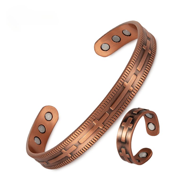Meathly Set di gioielli in rame puro magnetico vintage con croce regolabile, bracciali, anelli, gioielli per la salute e l'artrite, ridimensionabili, per donne e uomini