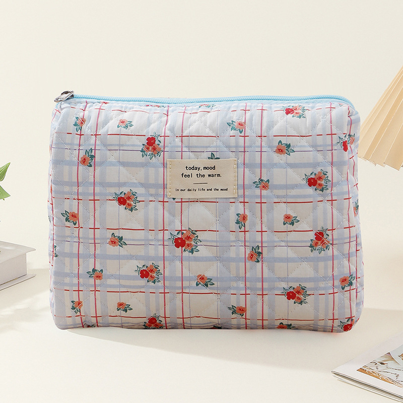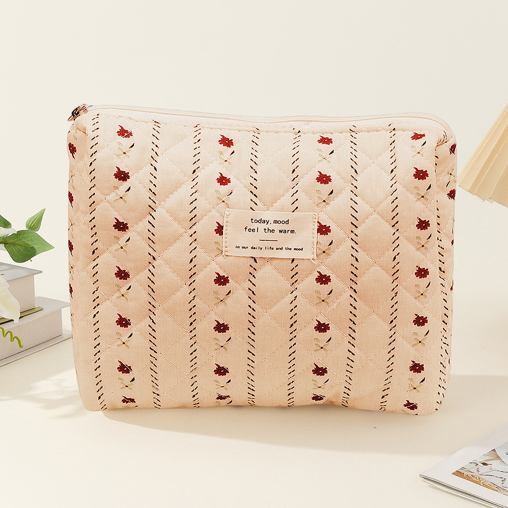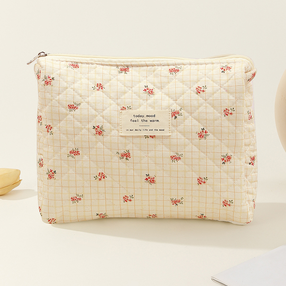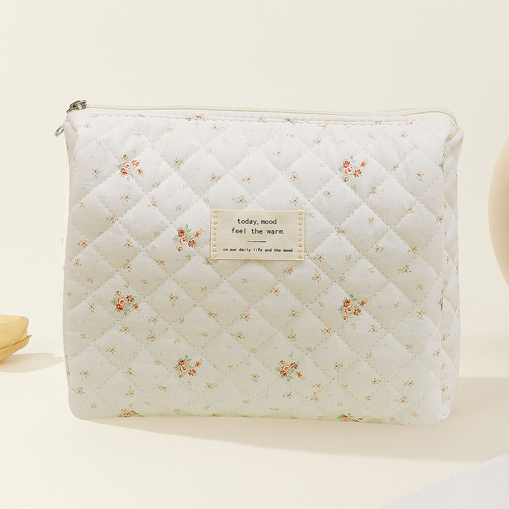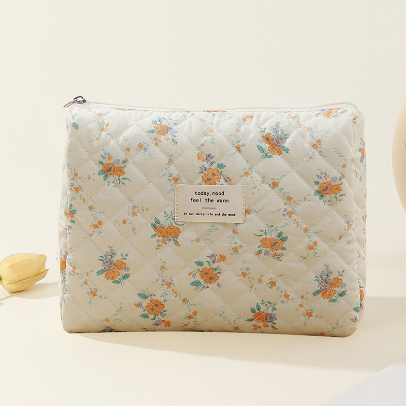 Borsa cosmetica trapuntata di media e grande capacità, piccola borsa portaoggetti floreale portatile in cotone trapuntato con fiori