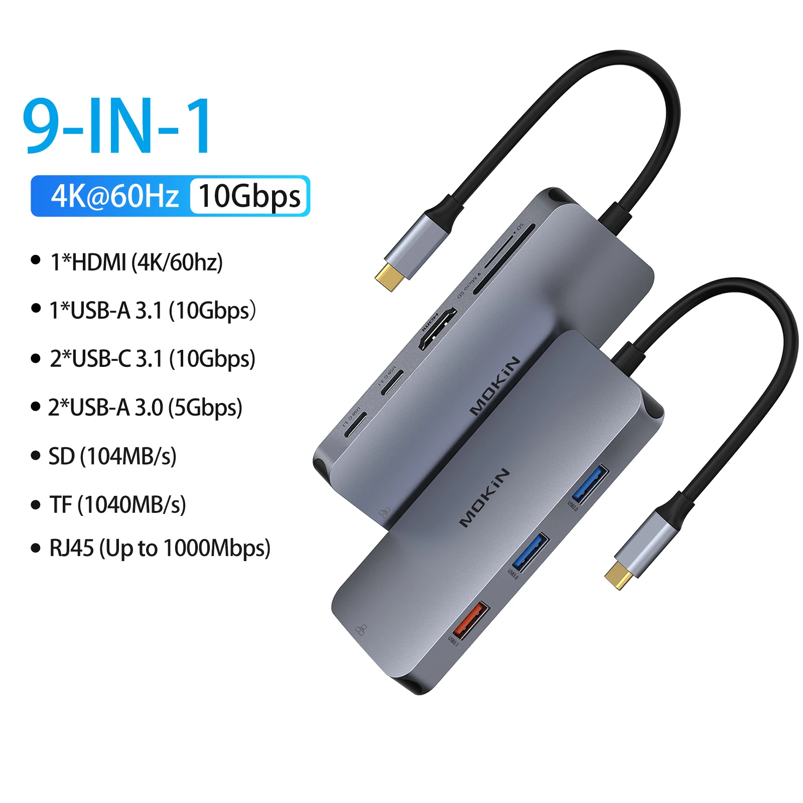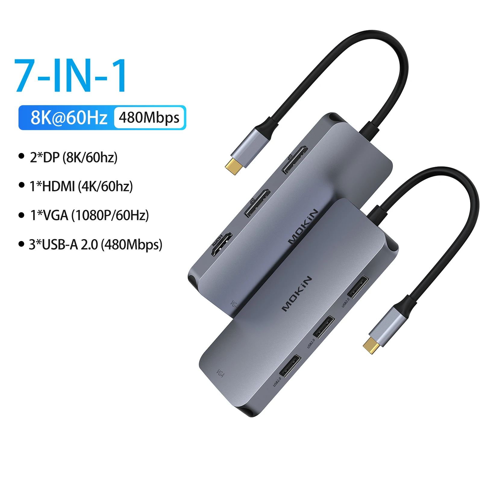 7 IN 1 USB C Docking StationMOKiN USB C multiport hub equips with 2 *DP4K@60HZ, 1*HDMI4K@60Hz, 1*VGA1080P@60Hz, 3*USB-A 2.0480Mbps. This USB C hub turns a Thunderbolt 3 compatible PC laptop into a mobile workstation, saving you valuable desktop space