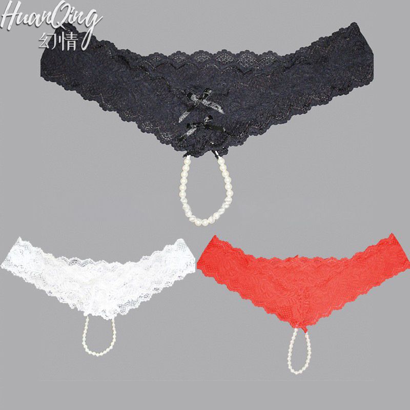 Mutandine erotiche sexy con fiocco in pizzo e perle, cavallo aperto, perizoma non rimovibile per donna 6044