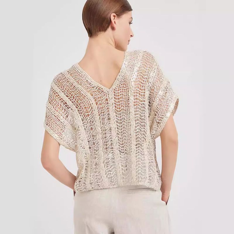 Nanyou Pingshi 2024 Summer New Commuting Versatile Heavy Sequin Hollow Pullover V-Neck Knitted Sweater Two-Piece Set