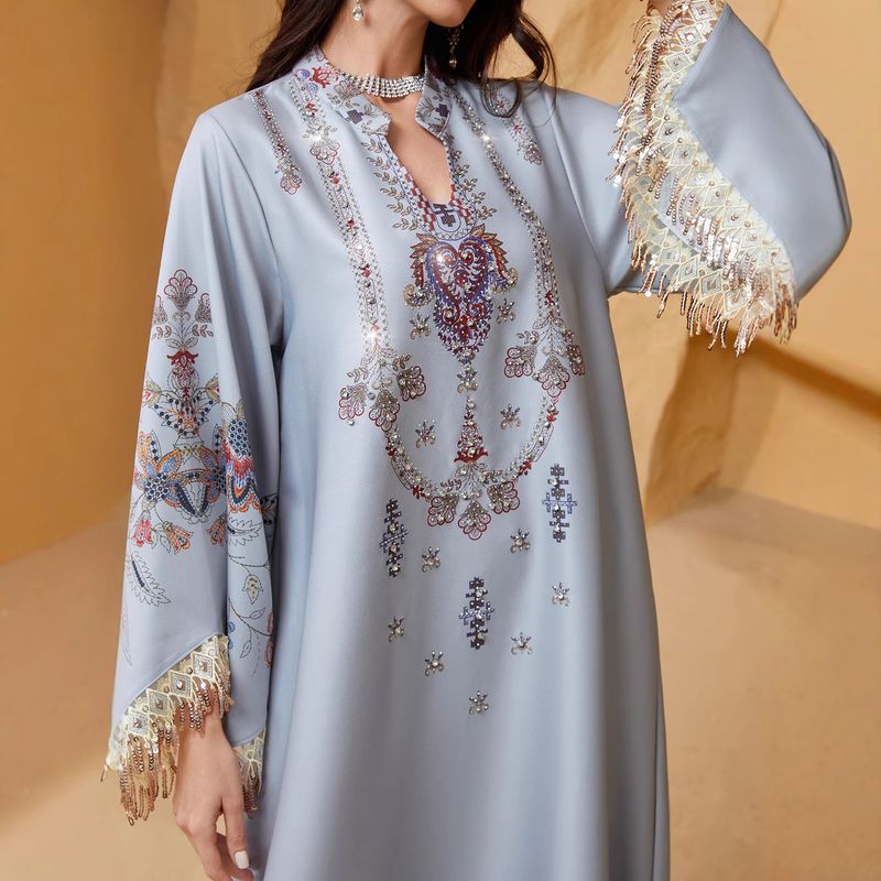 NC13 Abito da donna musulmana con scollo a V, nappa ricamata, elegante abito arabo Abaya