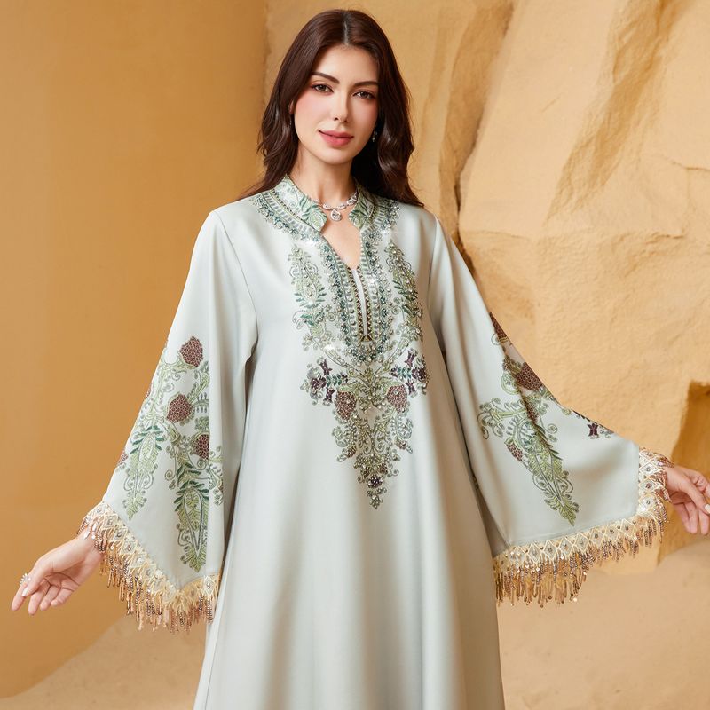 NC21 Muslim Women's Robe V-neck Printed Tassel Elegant Arabic Dress Abaya