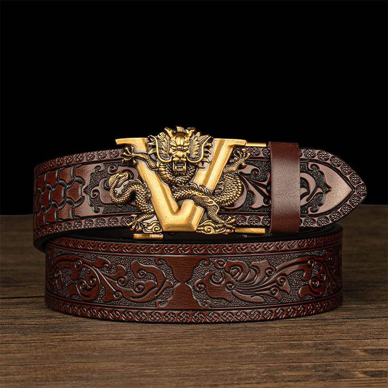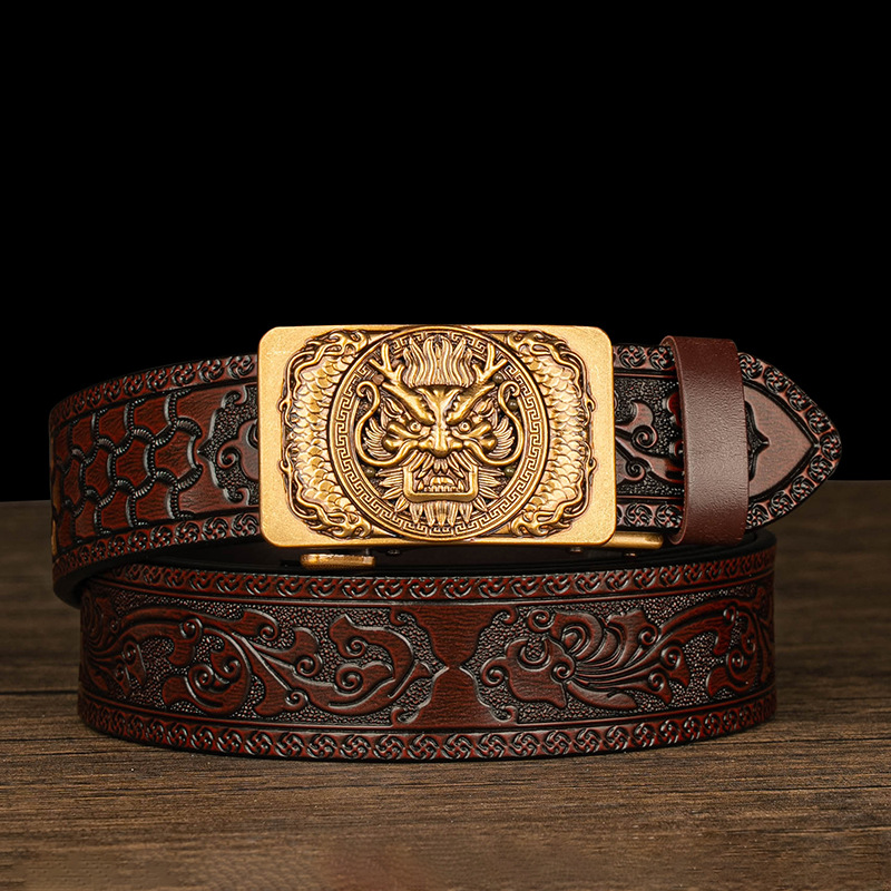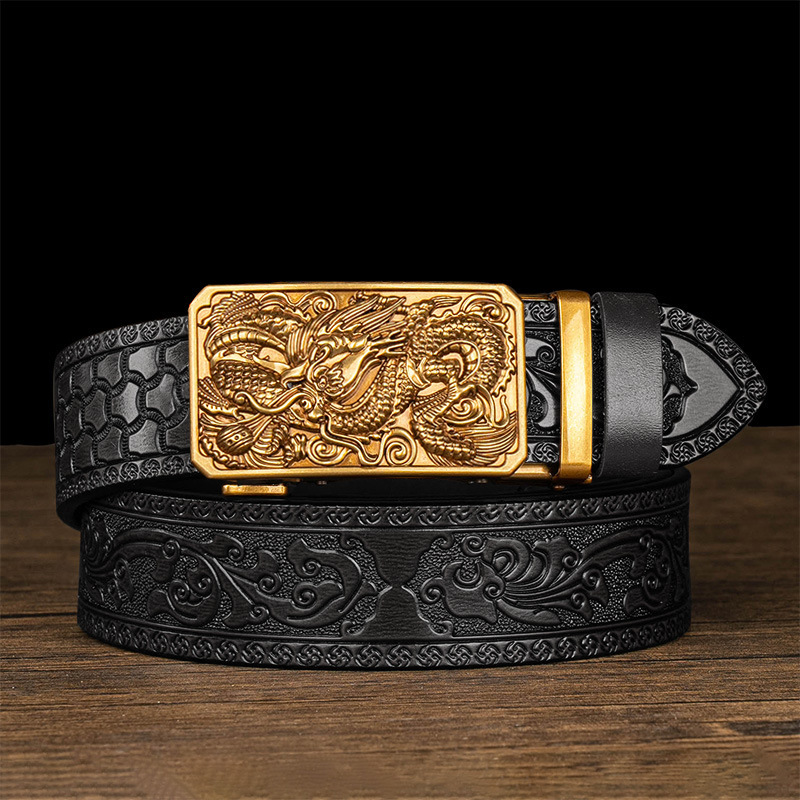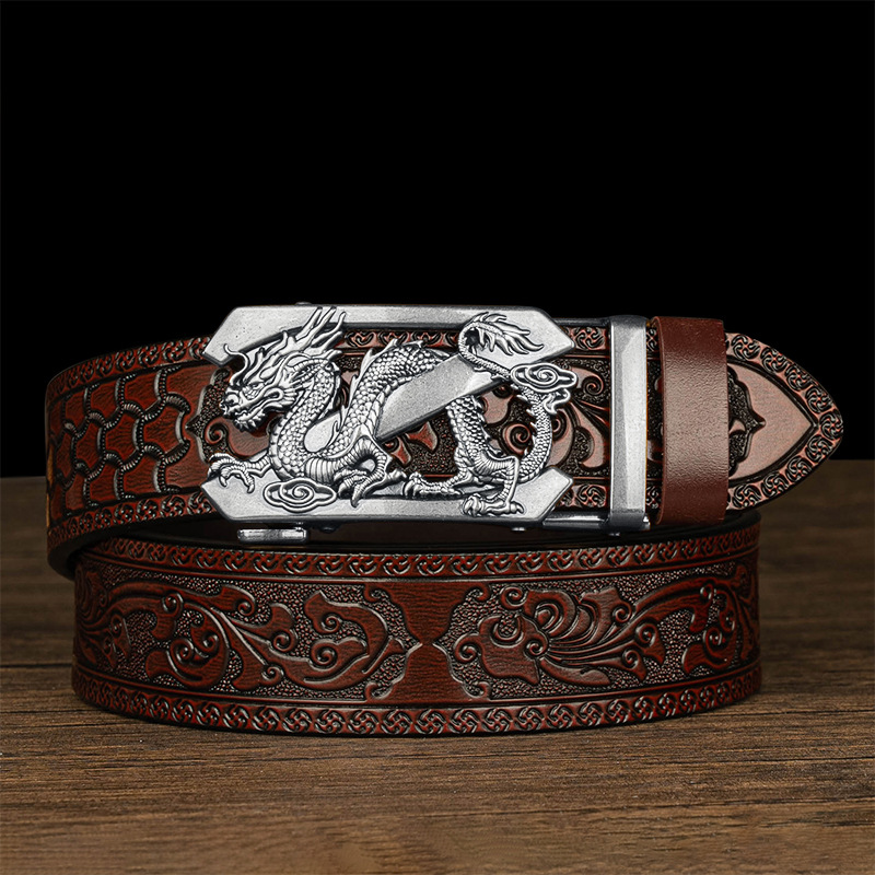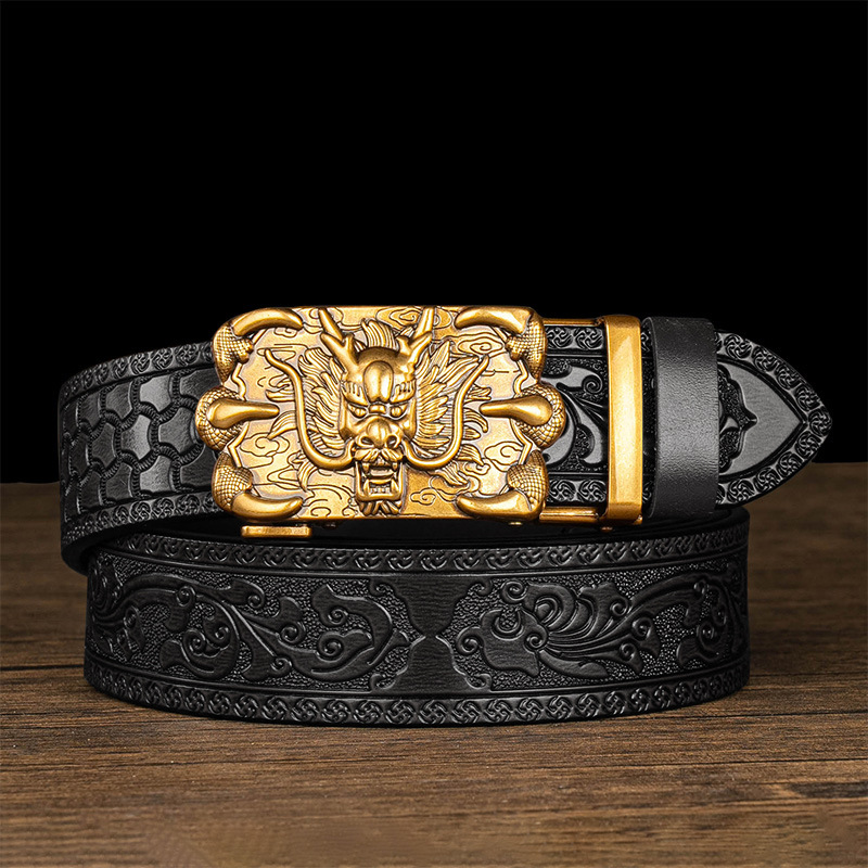 Nuovo modello di erba Tang Domineering intagliato da uomo automatico cintura con fibbia in rame con cintura personalizzata in rilievo a sei artigli di drago di vendita calda