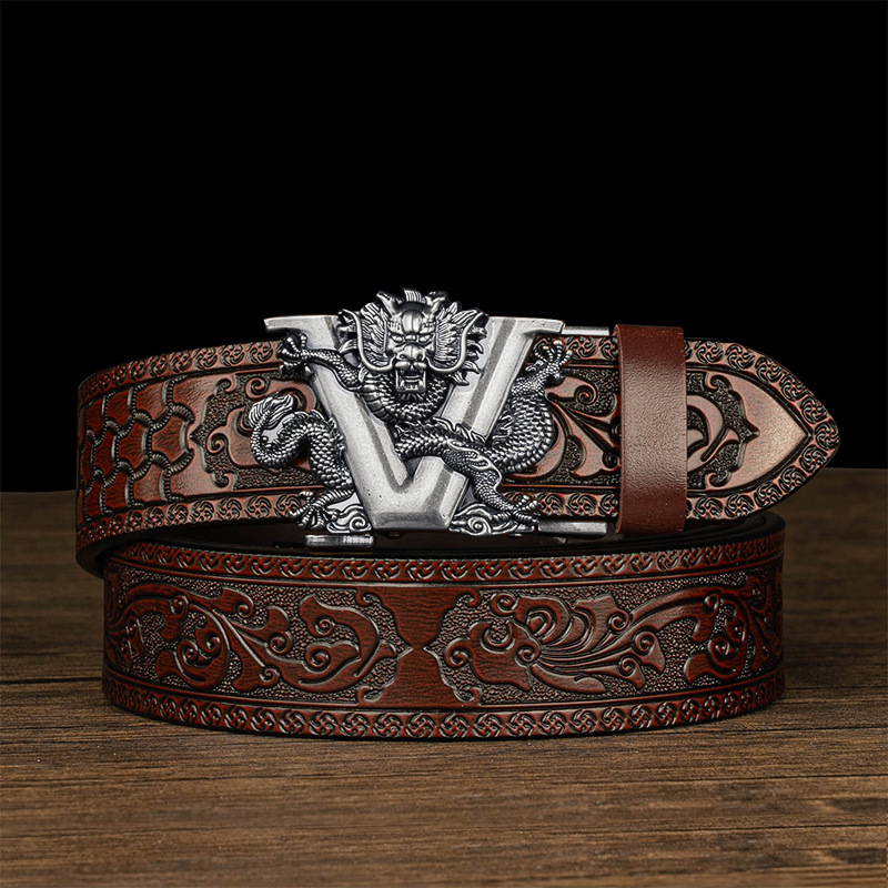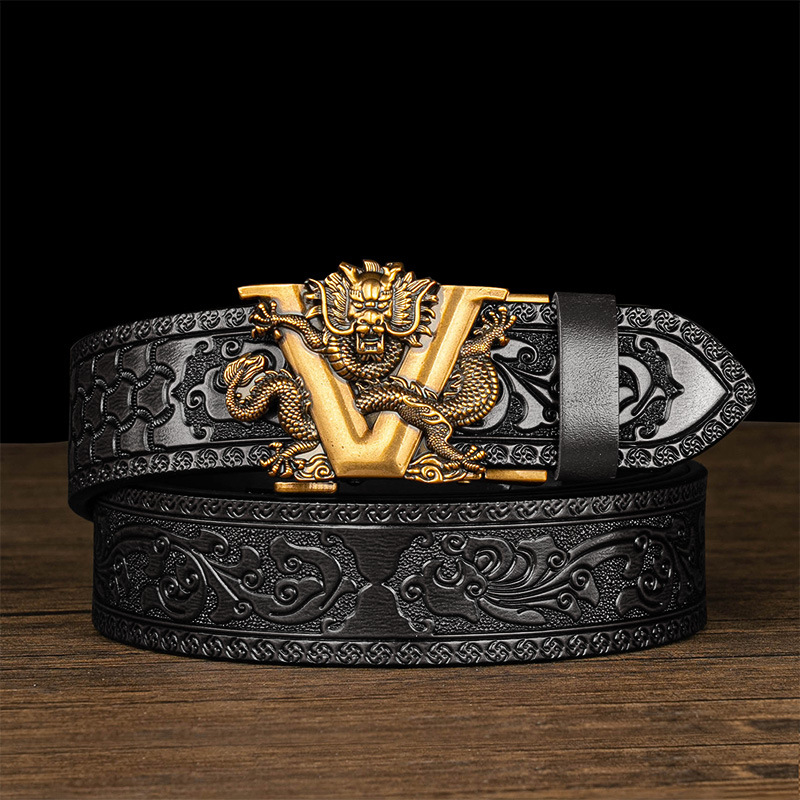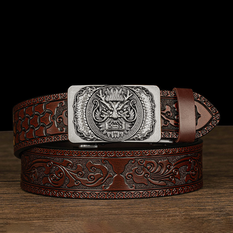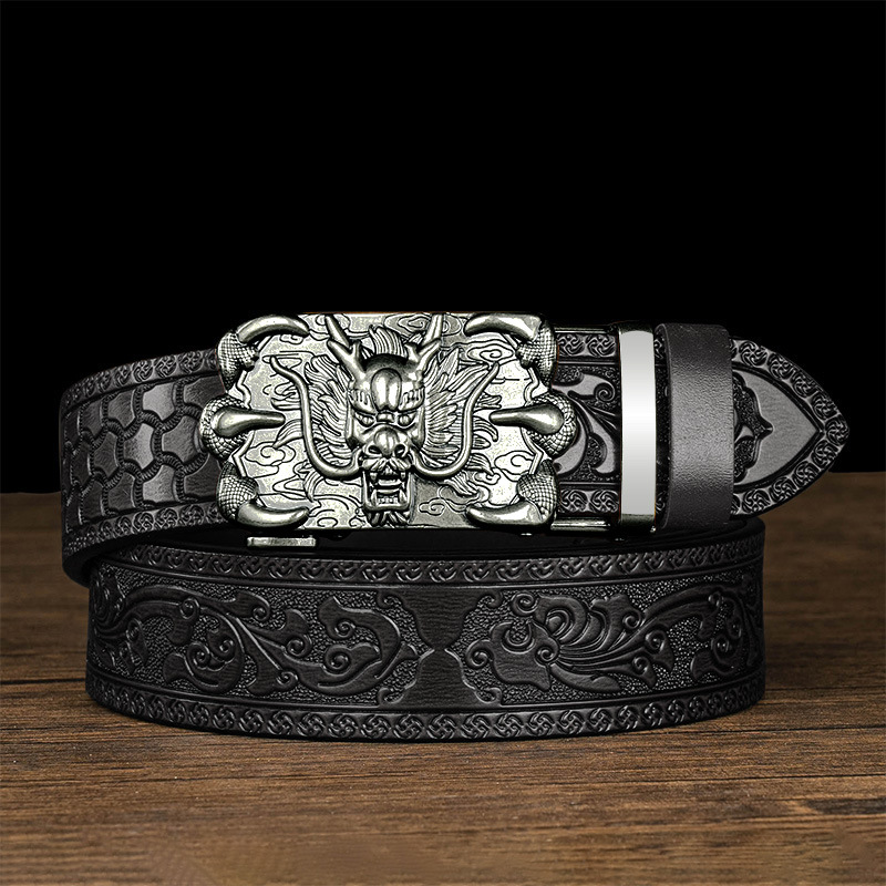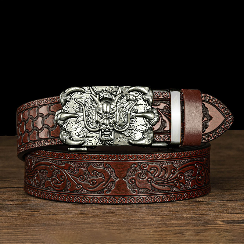 Nuovo modello di erba Tang Domineering intagliato da uomo automatico cintura con fibbia in rame con cintura personalizzata in rilievo a sei artigli di drago di vendita calda